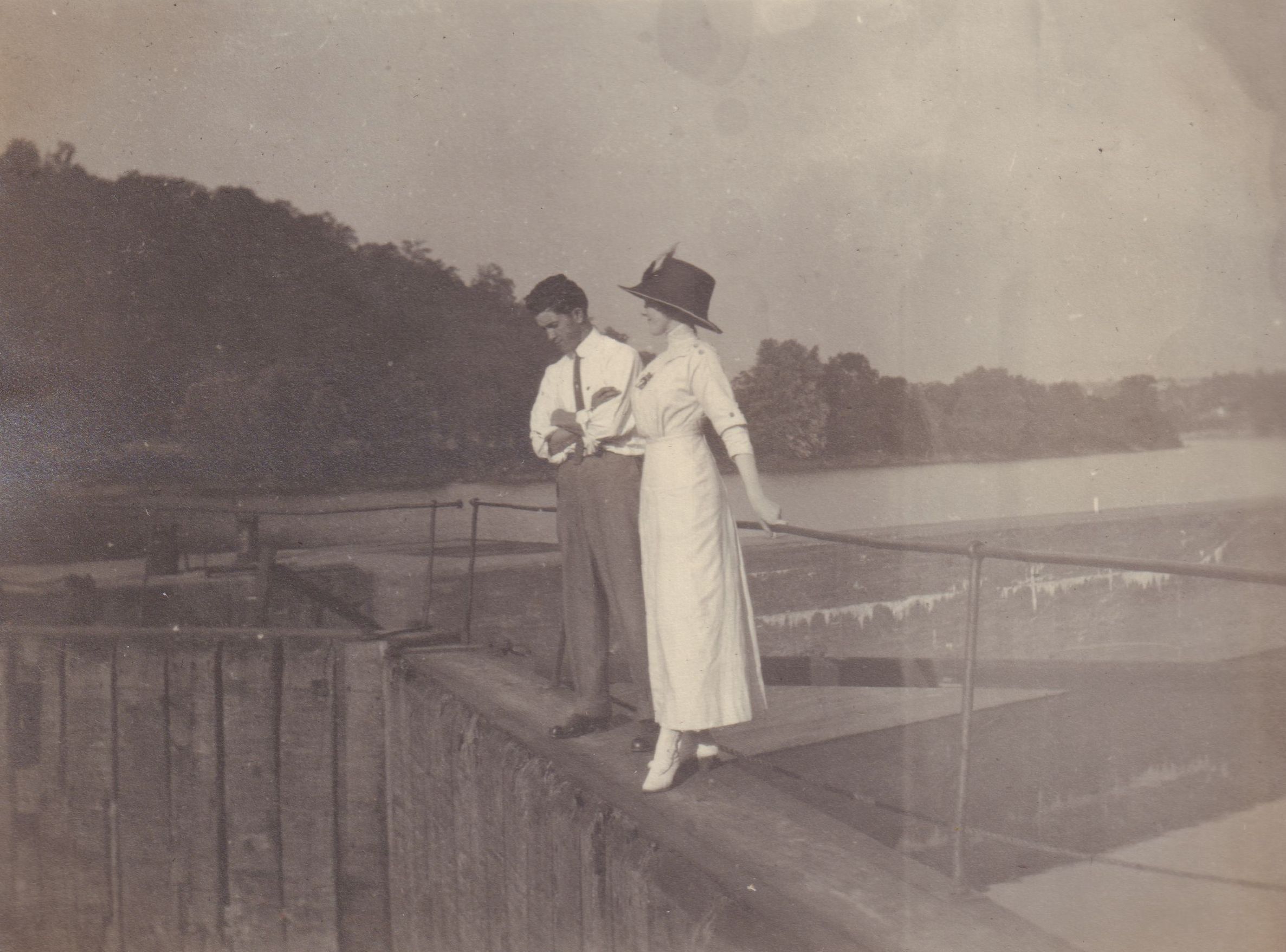 SOURCE CITATION: Waynesburg College Scrapbook, Photo 34 - Couple at No. 6 Lock and Dam on the Monongahela River at Rices Landing, Jefferson Township, Greene County, Pennsylvania; dated May 1912; item no. CAND-AN015-0034, scrapbook assembled by Paul Waddell Knox [1891-1965], Waynesburg College, Class of 1913; Candice Lynn Buchanan Collection; Greene Connections Archives Project (GreeneConnections.com).