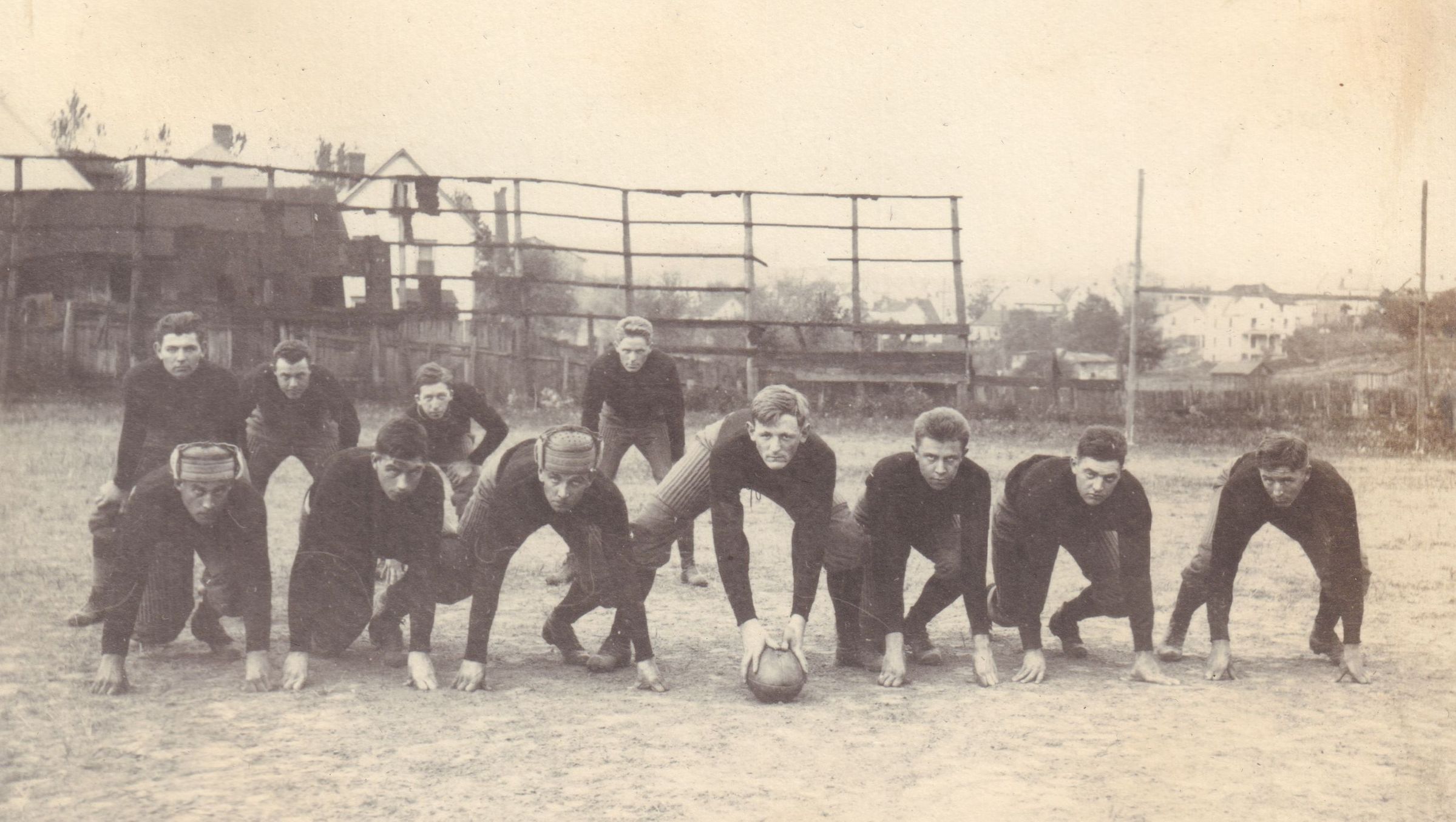SOURCE CITATION: Waynesburg College Scrapbook, Photo 64 - Waynesburg College football team, 1912; item no. CAND-AN015-0064, scrapbook assembled by Paul Waddell Knox [1891-1965], Waynesburg College, Class of 1913; Candice Lynn Buchanan Collection; Greene Connections Archives Project (GreeneConnections.com).