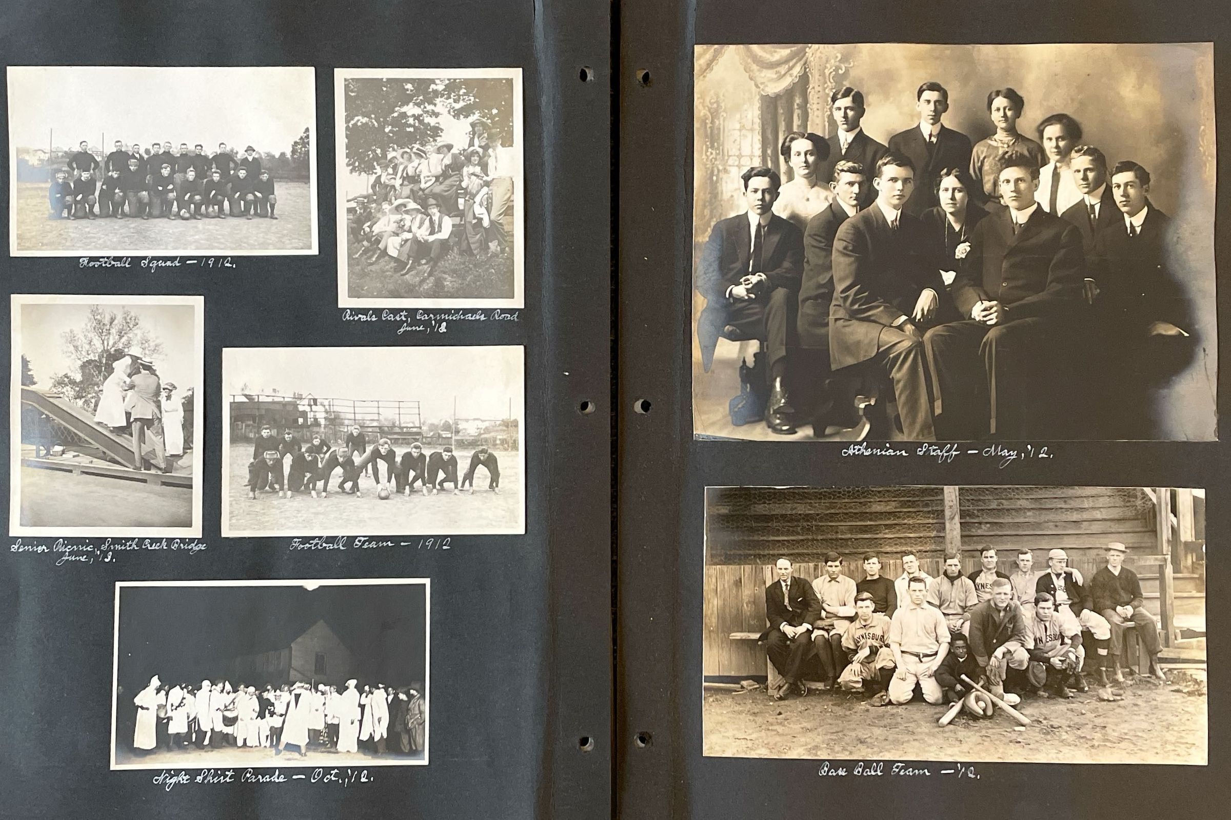 Scrapbook of Waynesburg College memories, 1910-1912, assembled by Paul Waddell Knox [1891-1965], Class of 1913. The album includes 83 images of classmates, friends, sports teams, social groups, and members of Company K, 10th Pennsylvania Volunteer Infantry, National Guard. Paul was the son of a Waynesburg College couple, Isaac Havely Knox (Class of 1889) and Theodosia Burr (Waddell) Knox (Class of 1884), who also appear in their son’s album. The album was acquired via online auction by Candice Buchanan, 2023.