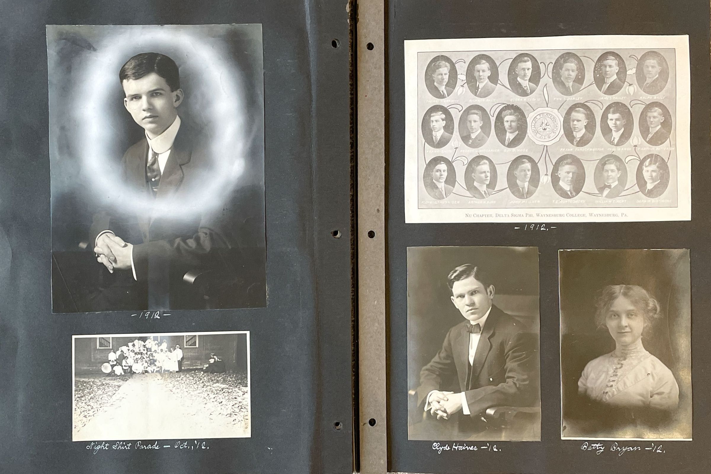 Scrapbook of Waynesburg College memories, 1910-1912, assembled by Paul Waddell Knox [1891-1965], Class of 1913. The album includes 83 images of classmates, friends, sports teams, social groups, and members of Company K, 10th Pennsylvania Volunteer Infantry, National Guard. Paul was the son of a Waynesburg College couple, Isaac Havely Knox (Class of 1889) and Theodosia Burr (Waddell) Knox (Class of 1884), who also appear in their son’s album. The album was acquired via online auction by Candice Buchanan, 2023.
