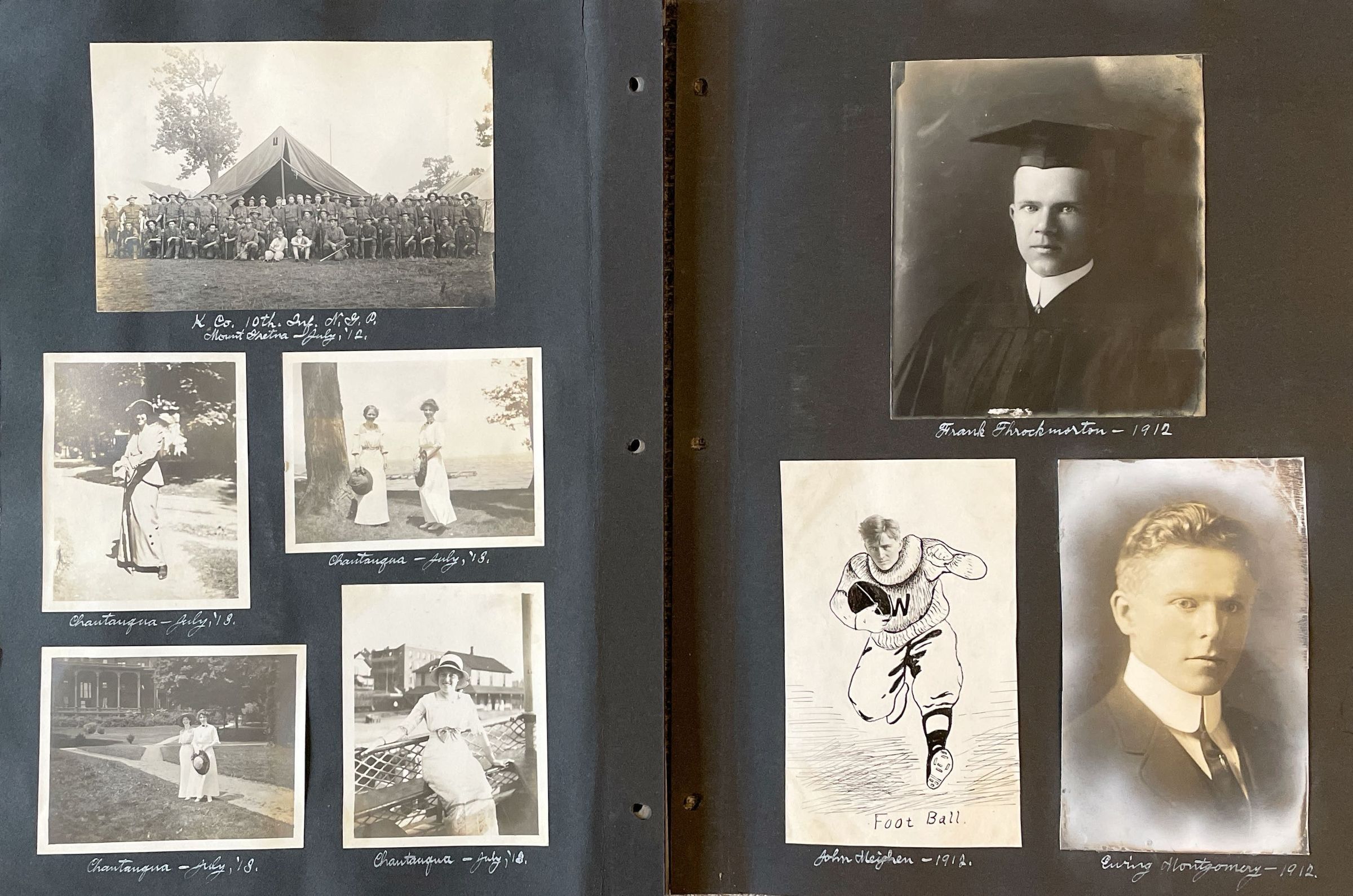 Scrapbook of Waynesburg College memories, 1910-1912, assembled by Paul Waddell Knox [1891-1965], Class of 1913. The album includes 83 images of classmates, friends, sports teams, social groups, and members of Company K, 10th Pennsylvania Volunteer Infantry, National Guard. Paul was the son of a Waynesburg College couple, Isaac Havely Knox (Class of 1889) and Theodosia Burr (Waddell) Knox (Class of 1884), who also appear in their son’s album. The album was acquired via online auction by Candice Buchanan, 2023.