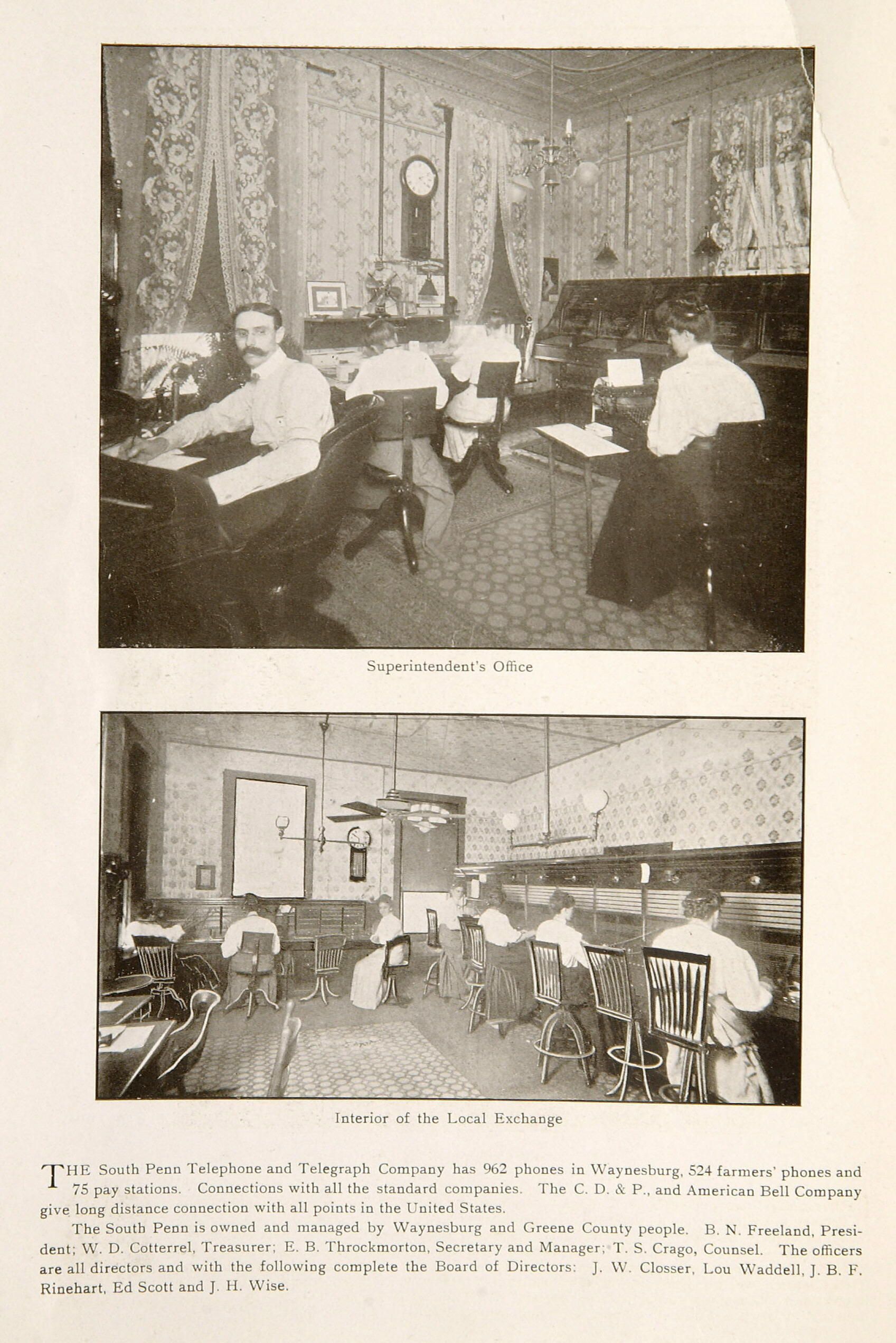 Source Citation: Fred High, Waynesburg Prosperous and Beautiful (Hamilton, Ohio: Brown & Whitaker, 1906), 110, South Penn Telephone and Telegraph Company. Item no. PUBL-AN003-0110A, Greene Connections Archives Project (www.GreeneConnections.com).