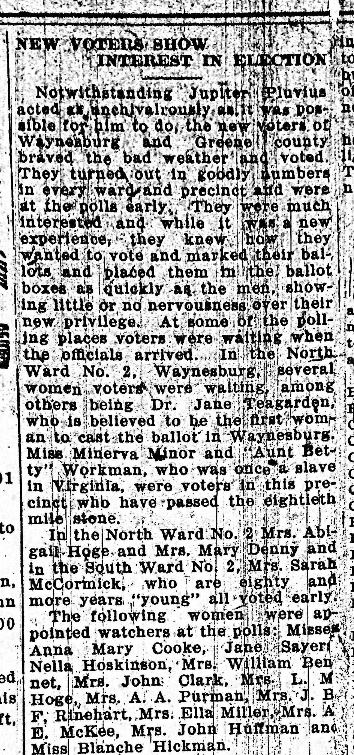 Notwithstanding Jupiter Pluvius acted as unchivalrously as it was possible for him to do, the new voters of Waynesburg and Greene County braved the bad weather and voted. They turned out in goodly numbers in every ward and precinct and were at the polls early. They were much interested and while it was a new experience they knew how they wanted to vote and marked their ballots and placed them in the ballot boxes as quickly as the men, showing little or no nervousness over their new privilege. At some of the polling places voters were waiting when the officials arrived. In the North Ward No. 2, Waynesburg, several women voters were waiting, among others being Dr. Jane Teagarden, who is believed to be the first woman to cast the ballot in Waynesburg. Miss Minerva Minor and "Aunt Betsy" Workman, who was once a slave in Virginia, were voters in this precinct who have passed the eightieth mile stone.