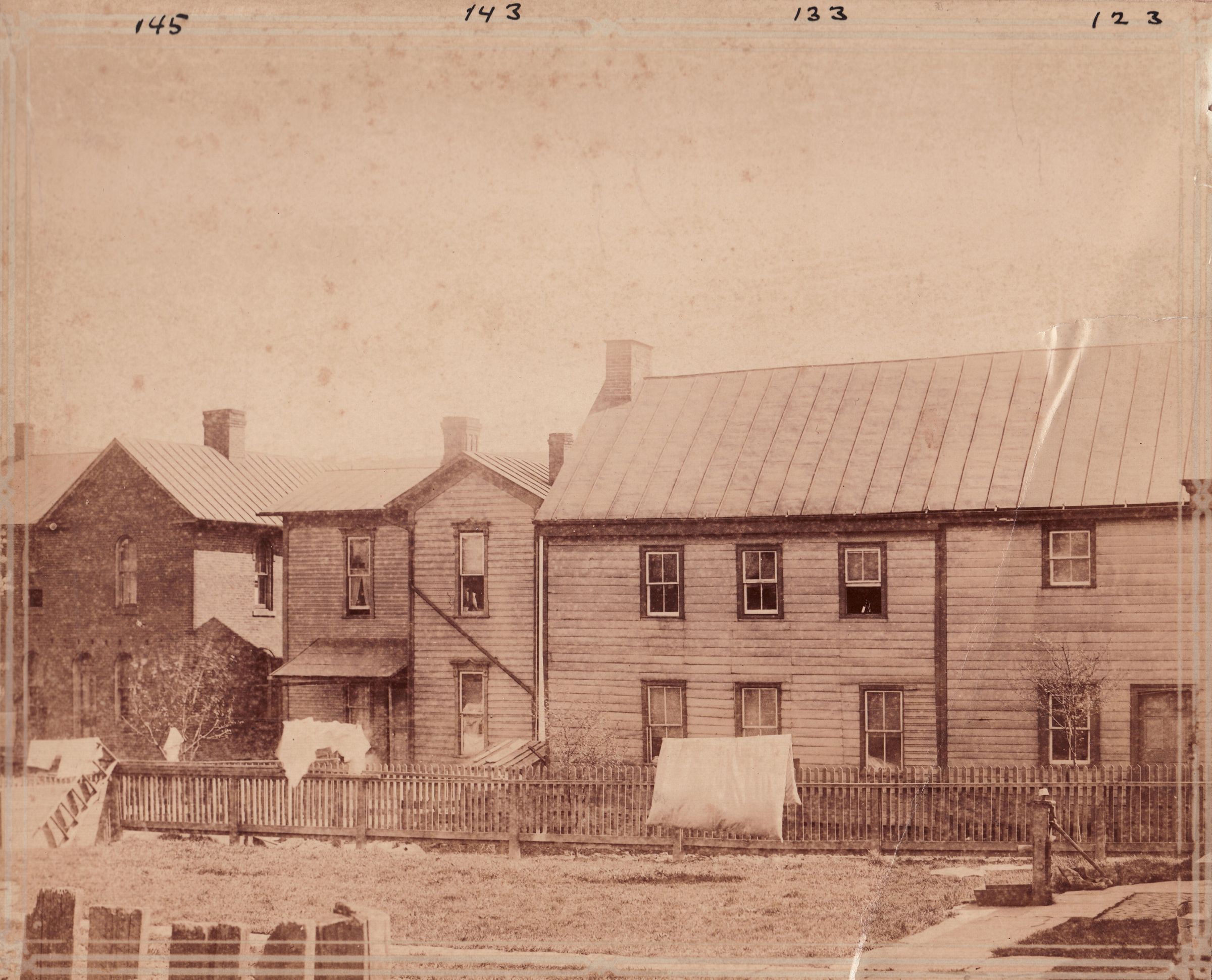 The series of captions quoted below indicate that the double house on the right is the weatherboard covered log cabin of Thomas Slater [1739-1815] whose land was purchased for the creation of Waynesburg, Greene County, Pennsylvania, at the time of the county's formation in 1796. The captions are contradicting however about the location of these buildings. There is actually a road called South Alley in Waynesburg, but the sloping landscape of that location does not seem to match that seen in the photo. The reference to Lincoln Street on the southern border of the original layout of Waynesburg in 1796, seems more likely to be the place pictured. The numbers mentioned in the captions appear handwritten across the top of the image and may refer to address street numbers.