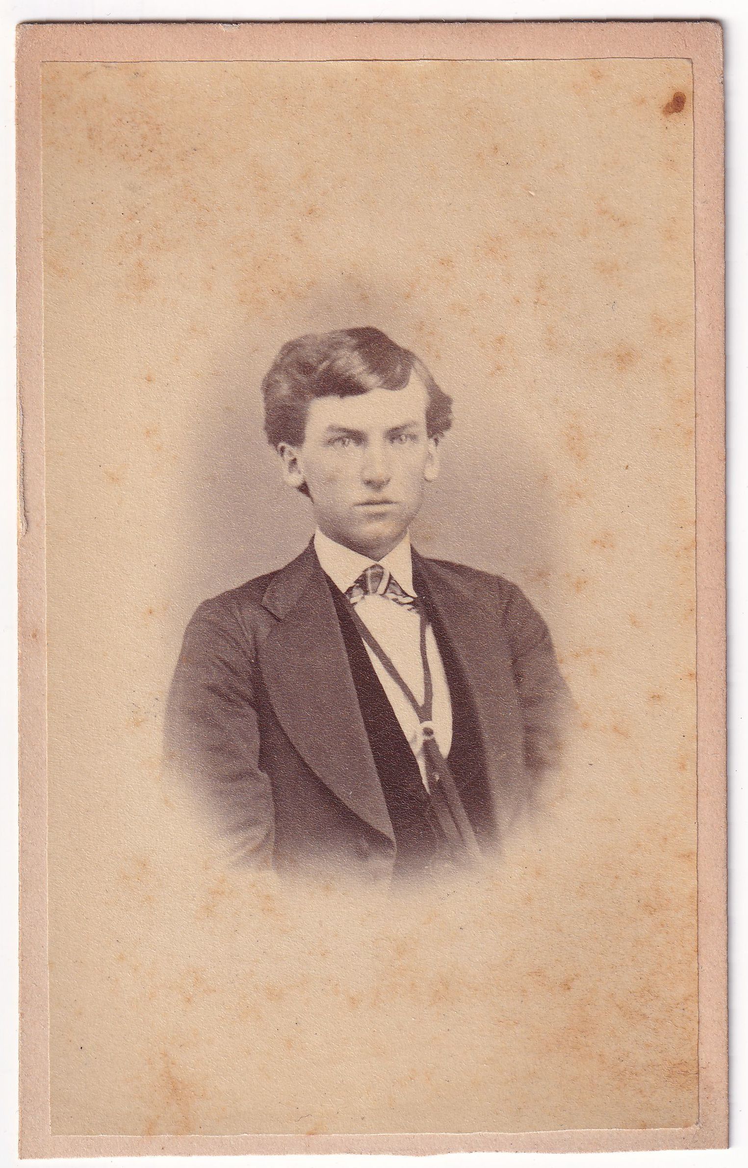 ACQUISITION NOTE: This photograph was purchased via eBay auction in 2024, by David O'Donoghue, who subsequently donated it to Candice Lynn Buchanan, in order to reunite the related images. From the same eBay vendor, Candice had purchased a later image of William (item # CAND-AN007-0032) as well as an image of his first wife, Sarah Bonar "Sadie" (Buchanan) McConnell (item # CAND-AN007-0031). Per correspondence with the eBay vendor, Candice learned that the images were obtained at a large estate sale in Illinois. Several antique albums yielded at least 100 images. The vendor photographed the album pages before removing each image from the album to be sold separately on eBay. Though the images were identified in the album with handwritten inscriptions, the eBay listings did not include those captions. Candice discovered the images while searching eBay for items associated with Waynesburg, Pennsylvania. Due to many years of associated research, she recognized Sadie immediately. To help ensure accuracy and prevent bias, Greene Connections volunteer Glenn Toothman also compared the eBay item with Sadie's Waynesburg College, Class of 1868 graduation picture (item # WAYN_AN001_1868_0001). To determine if any additional or related images might be available, Candice looked at the vendor's entire listings and quickly discovered the image of Sadie's husband (item # CAND-AN007-0032), identifiable by comparison to a later picture of him published in The Record: Historical, Personal and Other Sketches, Politics, Literature and Education, Social and Fraternal Affairs, Illustrated (Fargo, N.D.: Clement A. Lounsberry, 1895–1905), photograph of William McConnell [WorldCat: https://search.worldcat.org/en/title/12388412]. Though neither image was captioned on eBay, further evidence to support the identifications lay in the fact that the vendor had posted these two CDVs with Waynesburg, Pennsylvania, photographer stamps, in combination with 20 images from Angola, Indiana. William had taken Sadie to live with his family in Angola, Indiana, after their marriage in Waynesburg on 9 September 1869. At this point, Candice contacted the eBay vendor to request any known provenance or ties to additional images. The vendor supplied the details stated here, in combination with images of the album pages bearing the original inscriptions that confirmed the identities of Sadie and William. A younger photo of William that had appeared beside Sadie in the album had already been sold and was thought to be lost, until David saw the images Candice had posted to Greene Connections and reached out to say that he had acquired the younger photo, which is the one you see here [item # CAND-AN007-0033] and generously offered to send it to Candice. The vendor reviewed the entries for additional family members and found a cabinet card identified as William's second wife, Emma (Vandercook) McConnell, which Candice could still acquire. Based on the evidence at hand, it seems most likely that these McConnell images (4 in total, 1 of Sadie, 2 of William, and 1 of Emma) were in a collection that belonged to friends or relatives of the McConnells in Angola, Indiana. Though it would have been ideal to acquire the collection intact with original order and context, we are extremely grateful to the vendor who promptly did all they could to help us document and identify these precious images. And, of course, a grand thank you to David for helping us to bring the young images of William and Sadie back together.