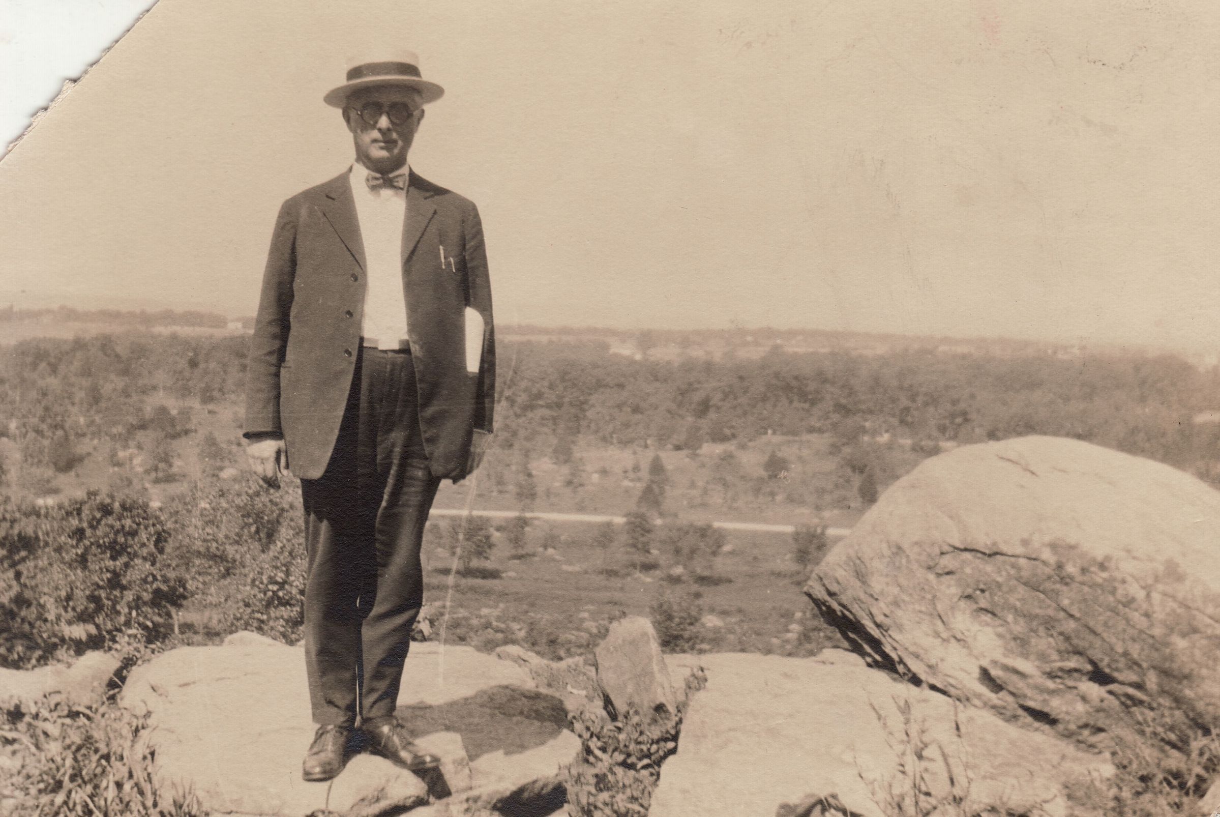 SOURCE CITATION: William Evans Minor [1861-1925] at Little Round Top in Gettysburg, Pennsylvania; circa 1923; item no. CARY-AN002-0003, Minor Series, Margaret Minor (Cary) Smith Collection; Greene Connections Archives Project (GreeneConnections.com).