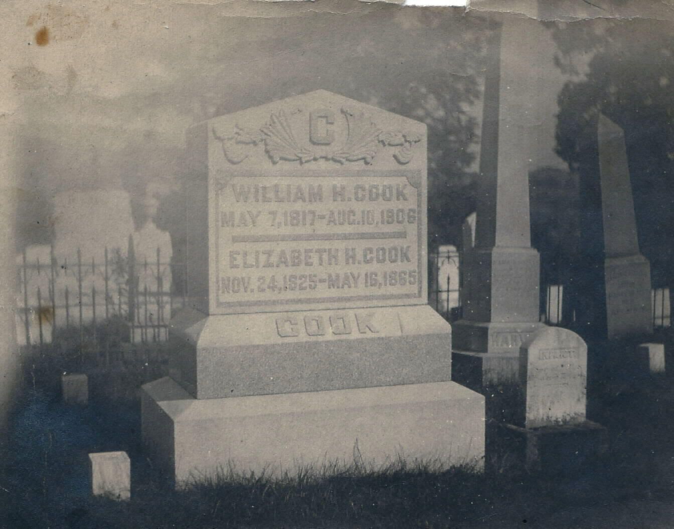 "William H. Cook / May 7, 1817 - Aug. 10, 1906 // Elizabeth H. Cook / Nov. 24, 1825 - May 16, 1865 // Infant, Son Of / Wm. H. & E. H. Cook"