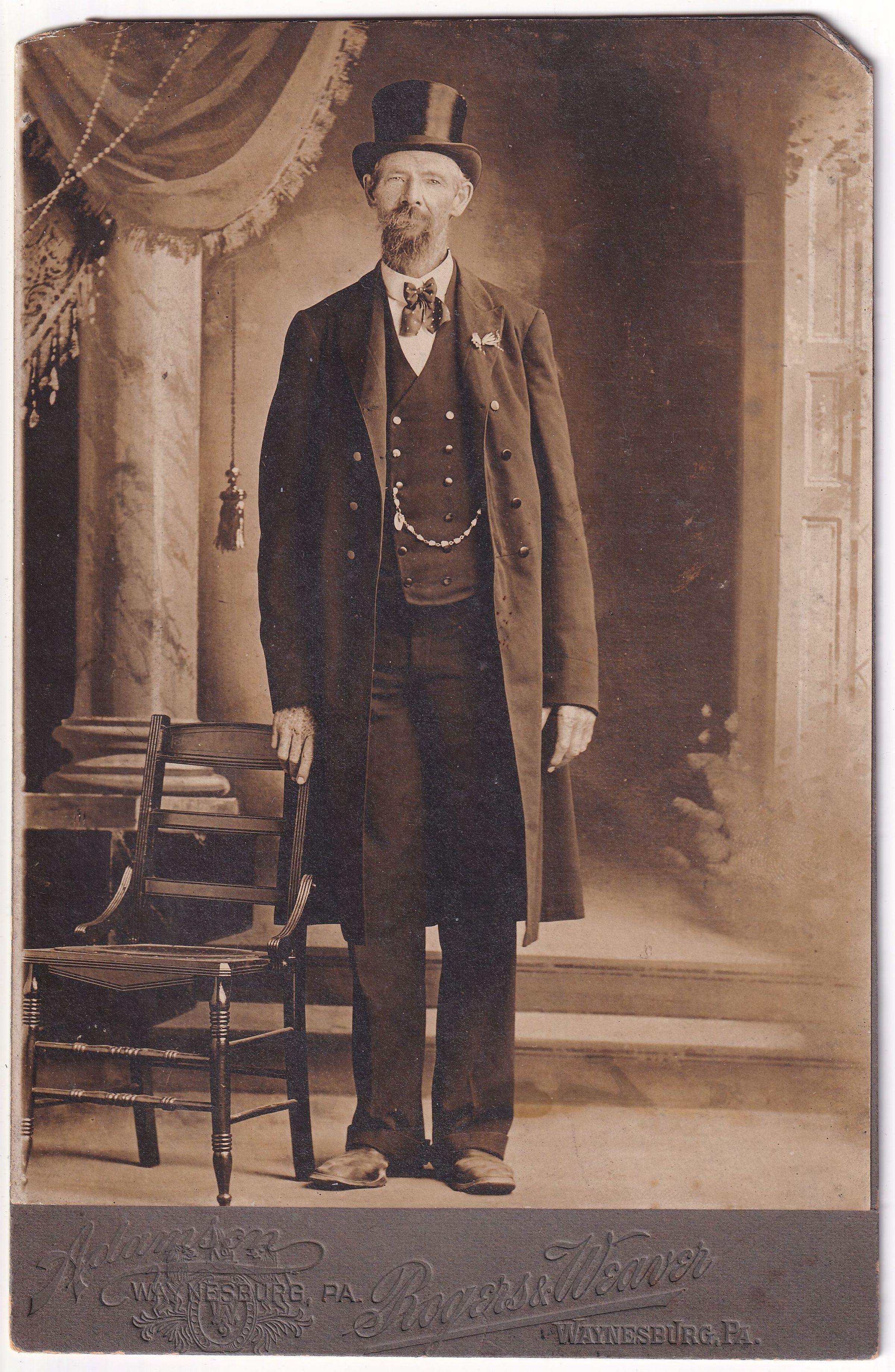 Original, professional photograph. There are two photographer stamps on the cardstock, which may indicate that one of the photographers sold their excess cards to the other, who added his mark. Left to right they read, "Adamson, Waynesburg, Pa." and "Rogers & Weaver, Waynesburg, Pa."Photograph Details