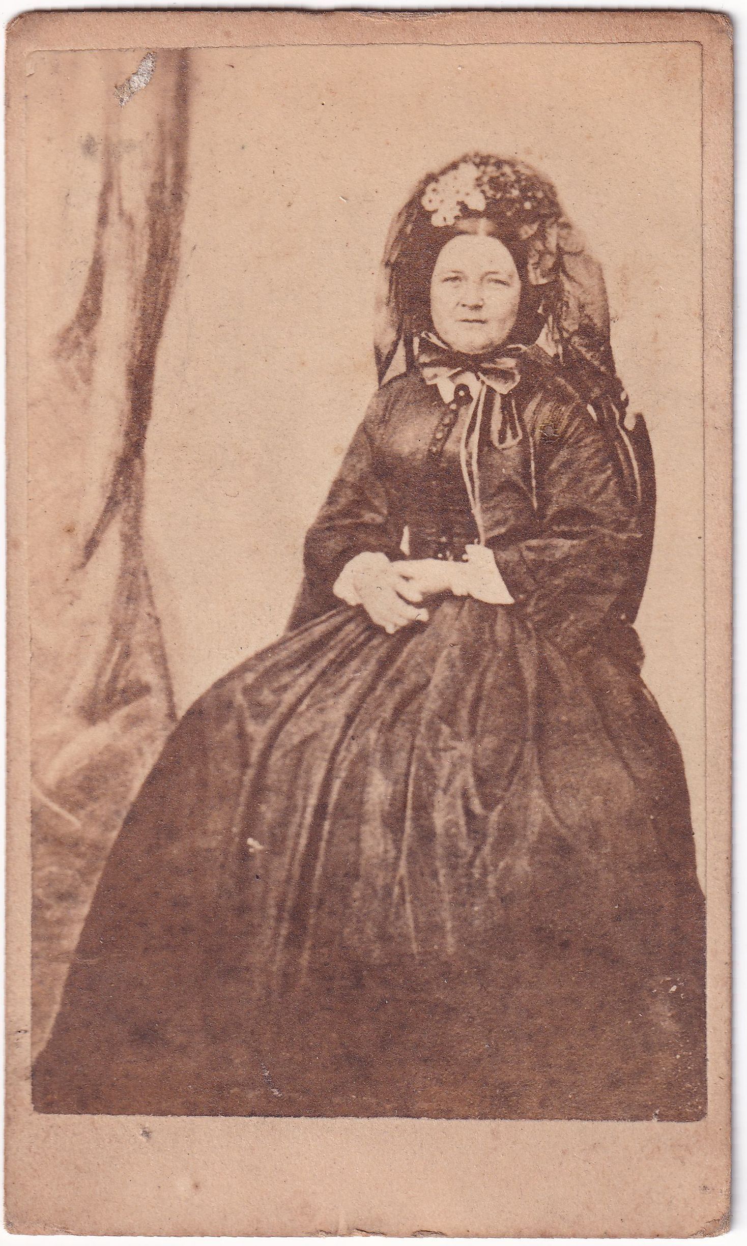 SOURCE CITATION: Willis-Nutt Album, Photo 04 - First Lady Mary (Todd) Lincoln in mourning attire; circa 1865-1882, image printed by G. W. Tomlinson, Photograph Rooms, 221 Washington St., Boston; item no. MORE-AN001-0004, Ammons-Moredock Collection, Greene Connections Archives Project (GreeneConnections.com).