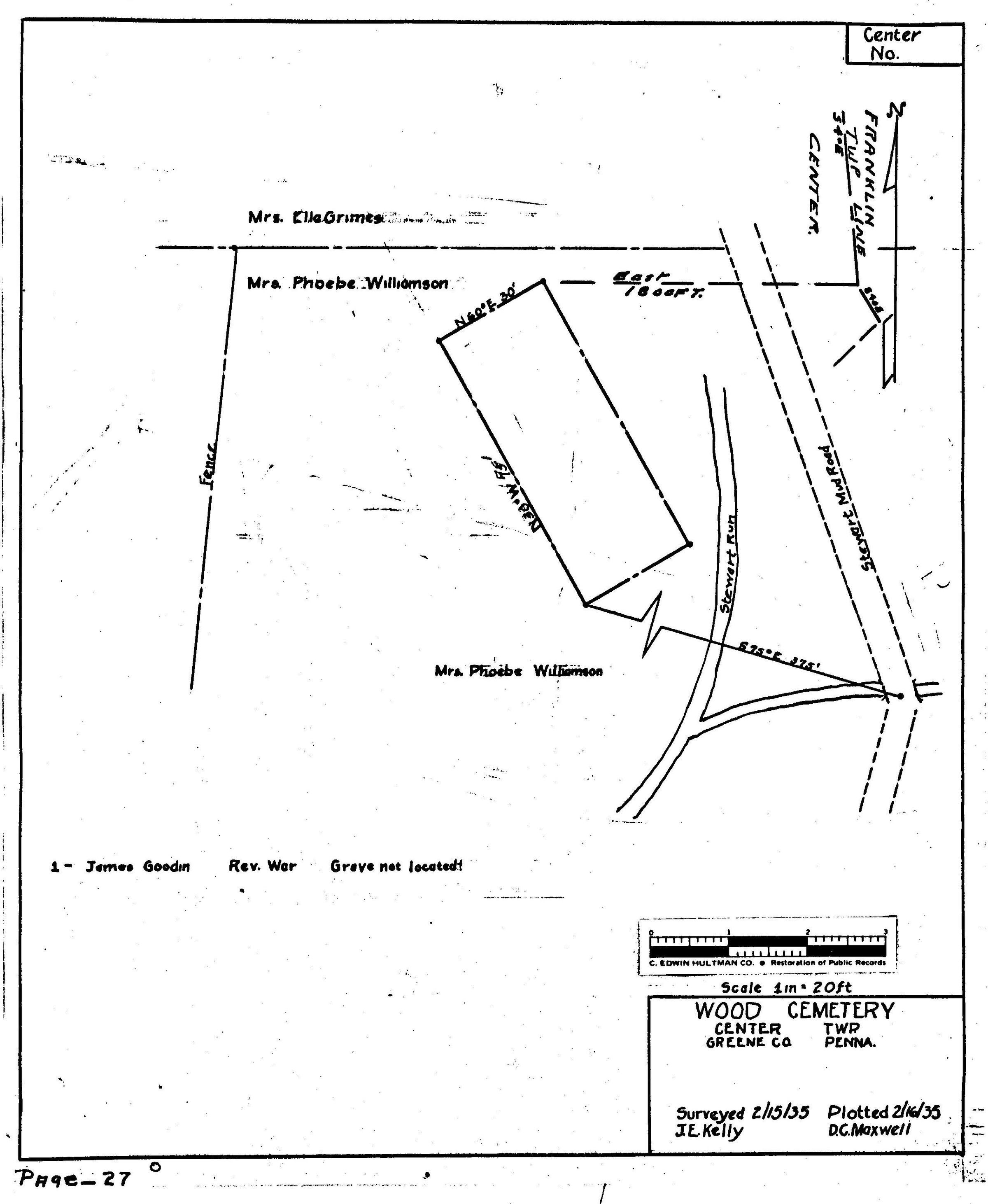 Source Citation: WPA Cemetery Plat - Pennsylvania - Greene County - Center Township - Wood Cemetery (1935), item no. 2016.3.45, Cemetery Plat (WPA) Collection, surveyed by Works Projects Administration, copy on file at the Clerk of Courts Office, Greene County Courthouse, Greene Connections Archives Project (www.GreeneConnections.com).