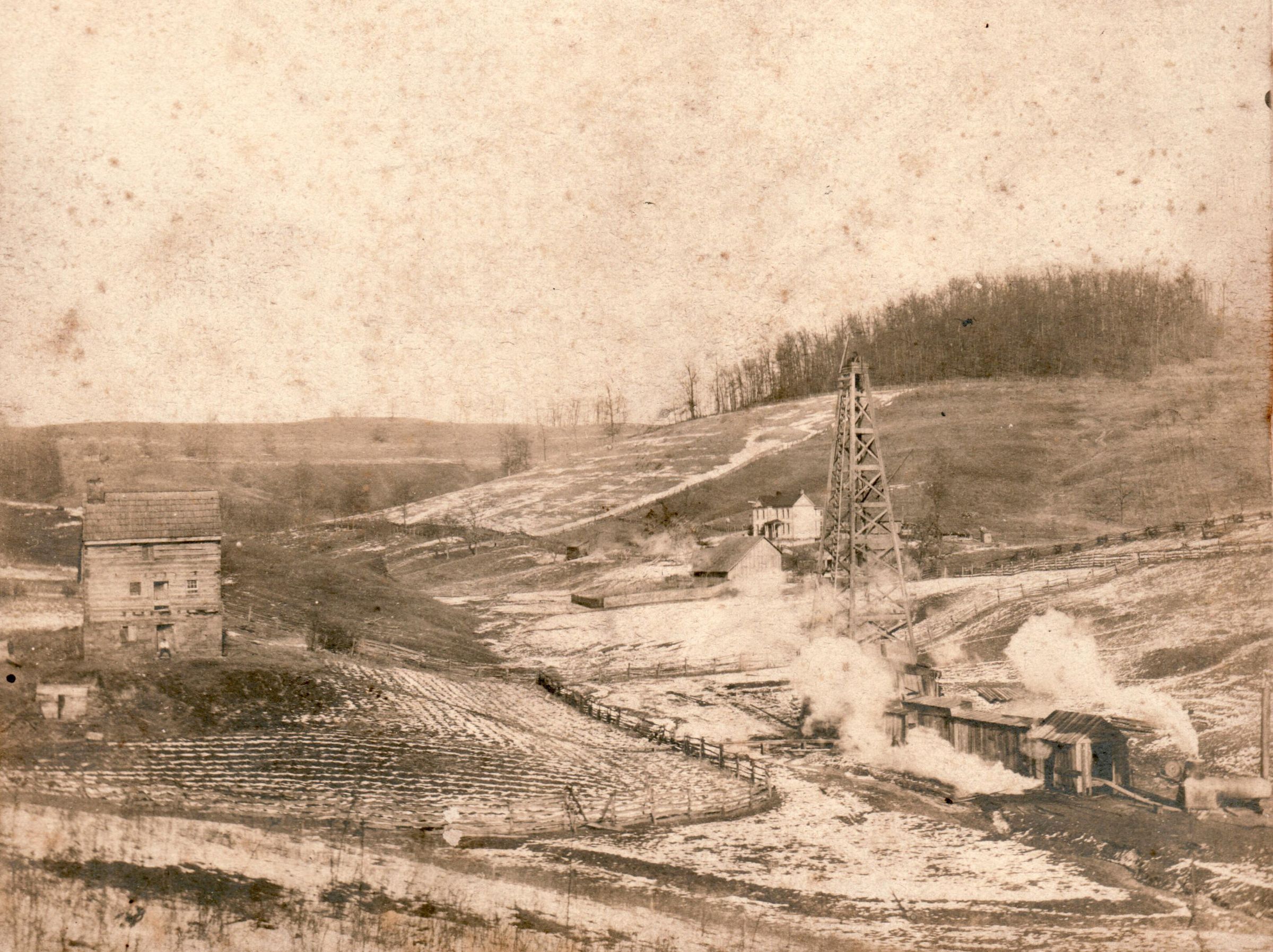 Source Citation: Wooden derrick and log cabin located between Spraggs and Brock in Wayne Township, Greene County, Pennsylvania, item no. COLE-AN004-0002-0001, Occupations Series, Terry Cole Collection, Greene Connections Archives Project (www.GreeneConnections.com).