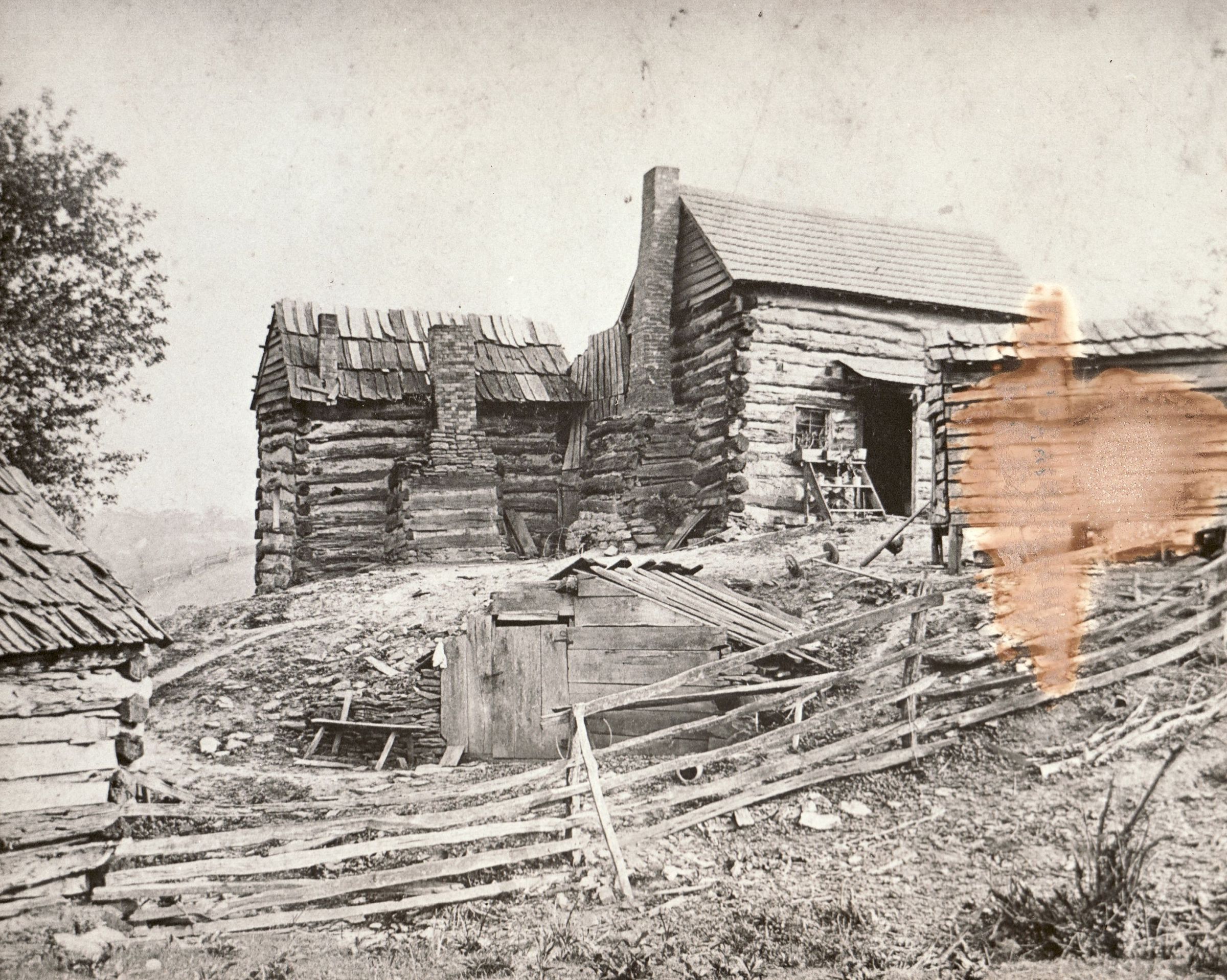 SOURCE CITATION: Log cabins built by John Hart (born 1756), near Ceylon, Cumberland Township, Greene County, Pennsylvania; circa 1900; item no. CGSP_AN006_0001_0000C, Esther Ruth Hart Series, Cornerstone Genealogical Society Collection; Greene Connections Archives Project (GreeneConnections.com).