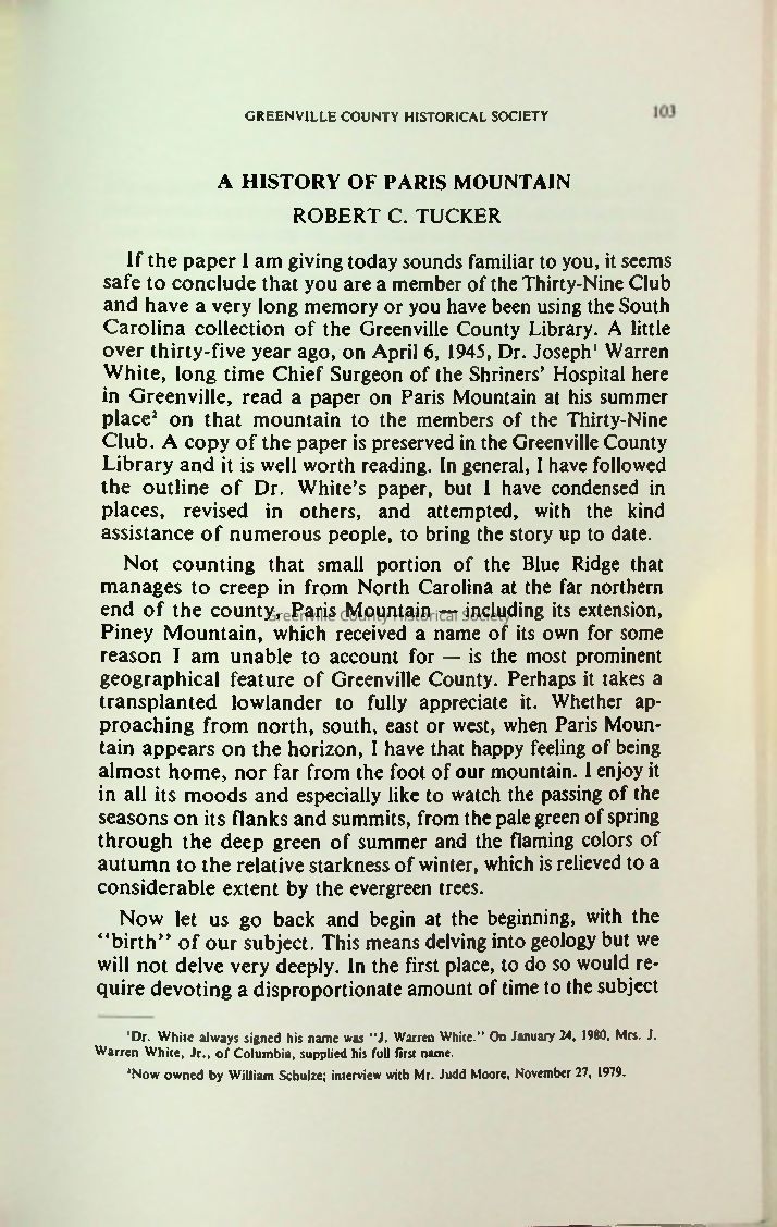 Robert C. Tucker’s paper explores the rich natural and human history of Paris Mountain, the most prominent geographic feature in Greenville County. Formed during the Ordovician period, the mountain served as a water source, recreational retreat, and residential area. It was home to notable figures like Waddy Thompson Jr., and the site of early development efforts including the Altamont Hotel. Paris Mountain State Park, created from former water system lands, preserves much of the area’s flora, fauna, and historical remnants. Once viewed as a remote obstacle, the mountain now stands as a valued natural, recreational, and historical asset to Greenville.Collection