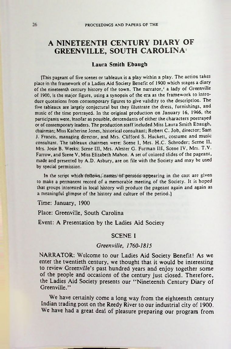 This dramatized pageant, presented as a Ladies Aid Society benefit in 1900, reenacts Greenville’s development from a Cherokee trading post into a thriving industrial city by century’s end. Through five historical tableaux, the narrative highlights pivotal figures such as Vardry McBee and Benjamin Perry, the town’s evolving architecture, education, and culture, and the profound impact of the Civil War. The diary-style script blends historical letters, eyewitness accounts, and reenactments, illustrating Greenville’s resilience, civic spirit, and growth. The performance originally featured descendants of historic figures and aimed to preserve Greenville’s rich nineteenth-century heritage for future generations.Collection