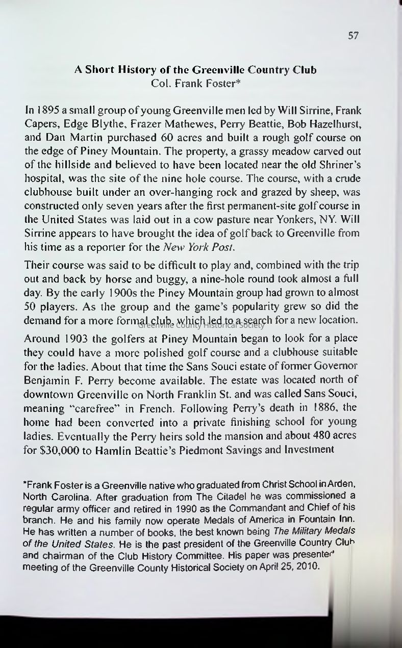 The Greenville Country Club traces its origins to 1895, when local golfers built a nine-hole course on Piney Mountain. In 1905, the group moved to the former Sans Souci estate, creating a vibrant club that became a social hub. In 1923, a new 18-hole course and clubhouse were opened on Byrd Boulevard. Renamed Greenville Country Club in 1927, it weathered hard times during the Depression thanks to J.E. Sirrine’s support. Major expansions followed, including the acclaimed Chanticleer course in the 1970s and Riverside redesign in 2007. Today, the club is a premier family-oriented facility with a rich sporting and social legacy.Collection