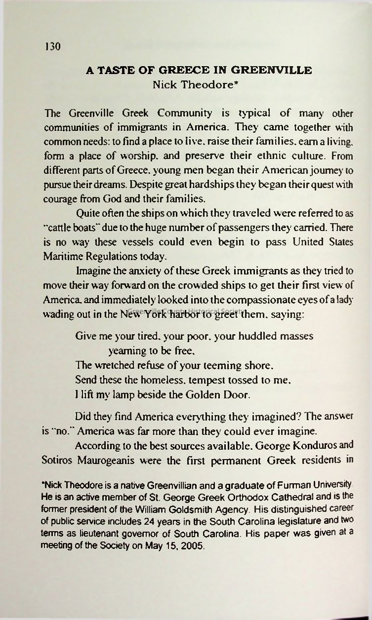 Nick Theodore’s “A Taste of Greece in Greenville” chronicles the journey of Greek immigrants who settled in Greenville, South Carolina, in the early 20th century. Facing hardship but driven by faith and ambition, they established homes, businesses—especially cafes and bakeries—and the St. George Greek Orthodox Church. These immigrants preserved their cultural heritage through religious observances, patriotic celebrations, and community institutions like AHEPA and Philoptochos. The Greenville Greek Festival and expanding church facilities reflect their lasting influence. Today, descendants thrive in diverse professions, reflecting a proud legacy of resilience, faith, and integration, with the belief that “the best is yet to come.”Collection