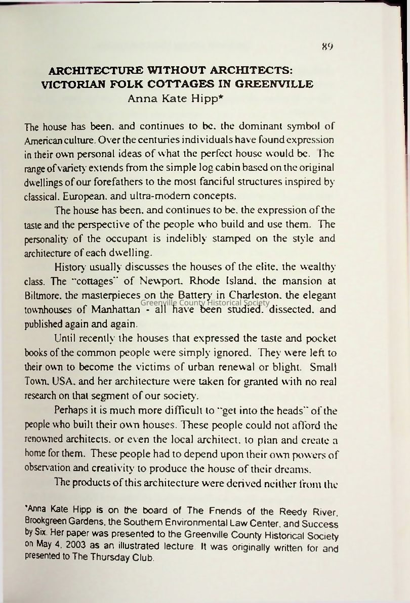 Architecture Without Architects: The Victorian Folk Cottage in GreenvilleEntry/Object ID