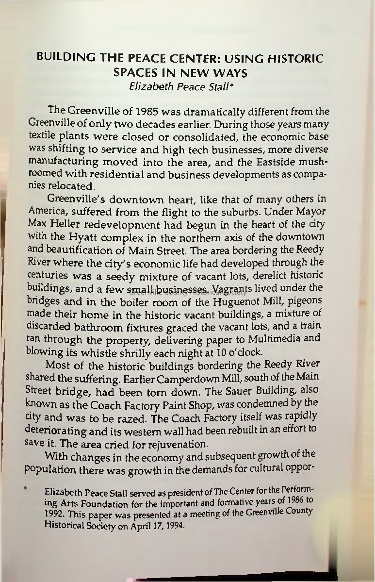 Elizabeth Peace Stall chronicles the creation of the Peace Center for the Performing Arts in Greenville, South Carolina, detailing the transformation of historic downtown buildings into a premier cultural venue. Spurred by declining downtown vitality and rising demand for arts facilities, civic leaders, donors, and planners collaborated to fund and build the center. Utilizing existing historic structures along the Reedy River, the project preserved architectural heritage while catalyzing urban revitalization. With over $42 million raised through public-private partnerships, the Peace Center opened in 1990, offering two performance halls and educational programs, significantly enriching Greenville’s cultural landscape and downtown redevelopment efforts.Collection