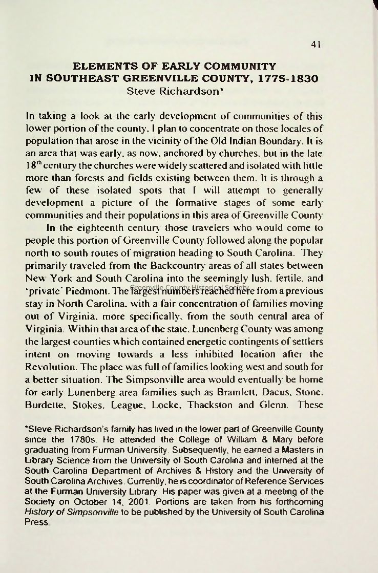 Steve Richardson’s Elements of Early Community in Southeast Greenville County, 1775–1830 explores the formation of rural communities in what is now the Simpsonville area. Settlers, mainly from Virginia and North Carolina, migrated along frontier routes, often intermarrying to form tightly knit extended families. Anchored by churches and springs, these settlements grew around accessible water sources. The Austin and Reed families played key roles in local development, while shifting Indian boundaries and post-Revolution land grants shaped land ownership. The paper traces how early homesteads evolved into small towns through religious, familial, and geographic networks that prefigured modern Simpsonville.Collection
