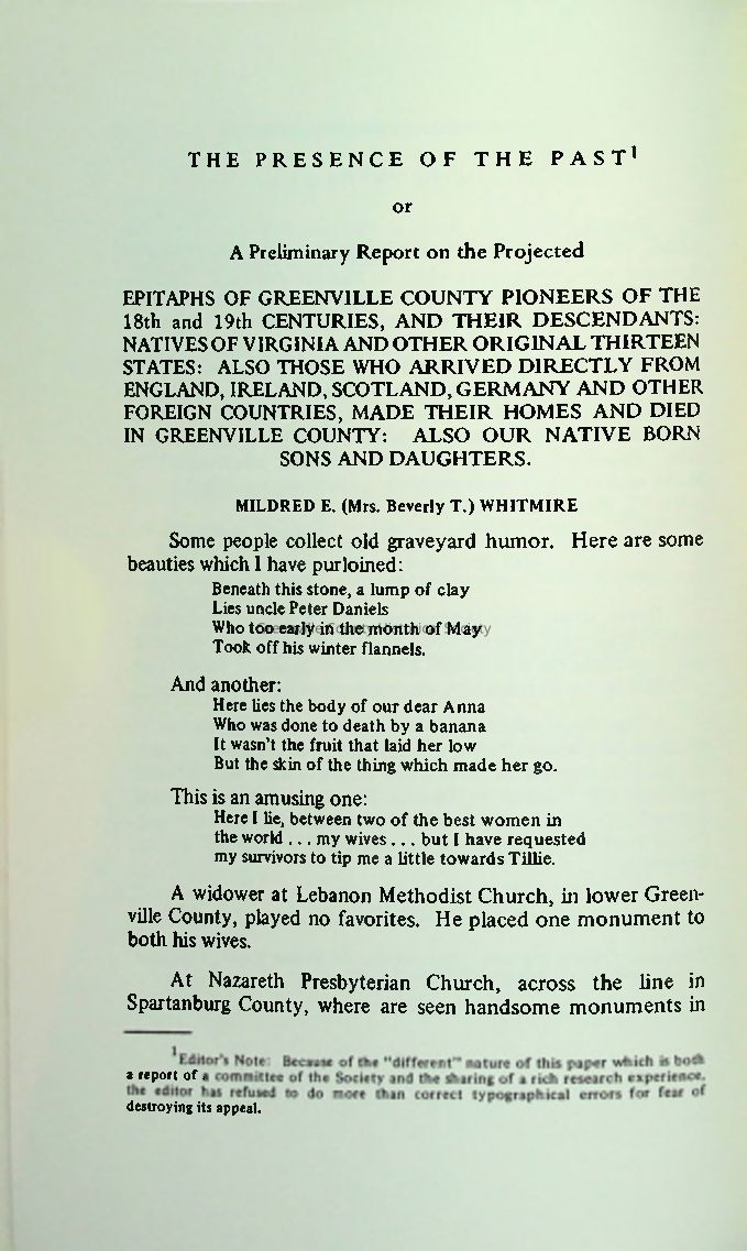 Mildred E. Whitmire’s The Presence of the Past documents a remarkable effort to preserve Greenville County's history through the recording of epitaphs from over 8,000 graves in 134 cemeteries. Led by Hattie Choice Schroder and continued by Whitmire after Schroder's passing, the project blends humor, reverence, and local lore while uncovering lost or abandoned burial sites. The report highlights challenges, touching stories, early settler customs, and ongoing threats from development. Volunteers played a crucial role, and their work serves not only as genealogical preservation but also as a vivid connection to the pioneers and families who shaped Greenville County.Collection