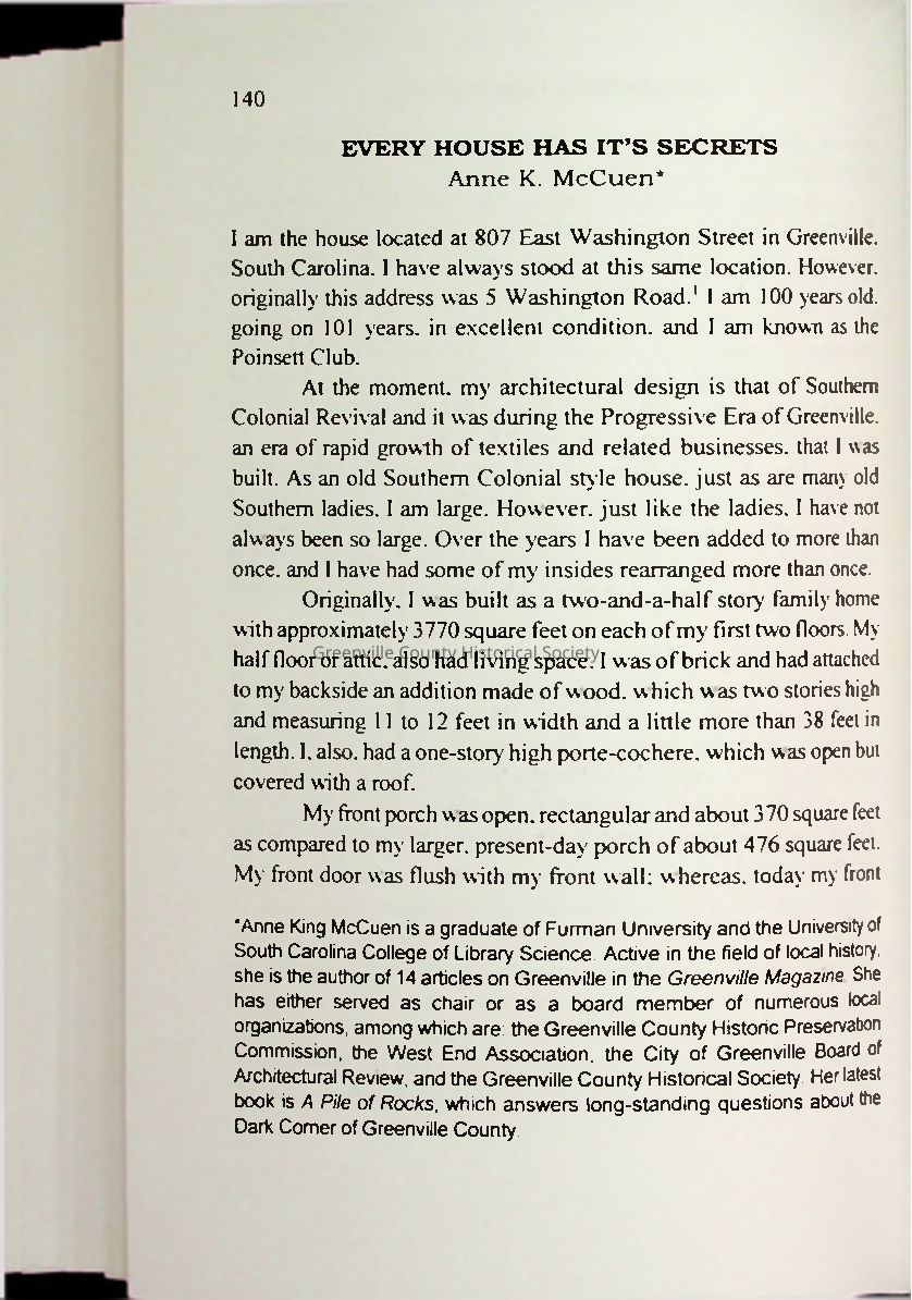 “Every House Has Its Secrets” by Anne K. McCuen is a first-person narrative told from the perspective of the historic house at 807 East Washington Street in Greenville, now the Poinsett Club. Built in 1904 by textile magnate Lewis Parker, the Southern Colonial Revival mansion witnessed Greenville’s transformation through fires, economic shifts, and changing ownership. Originally a grand family home, it later became a private men's club. The house recounts social events, renovations, the Great Depression, and cultural milestones like women and minorities joining the club. Through its story, the house mirrors a century of Greenville’s evolving social and architectural landscape.Collection