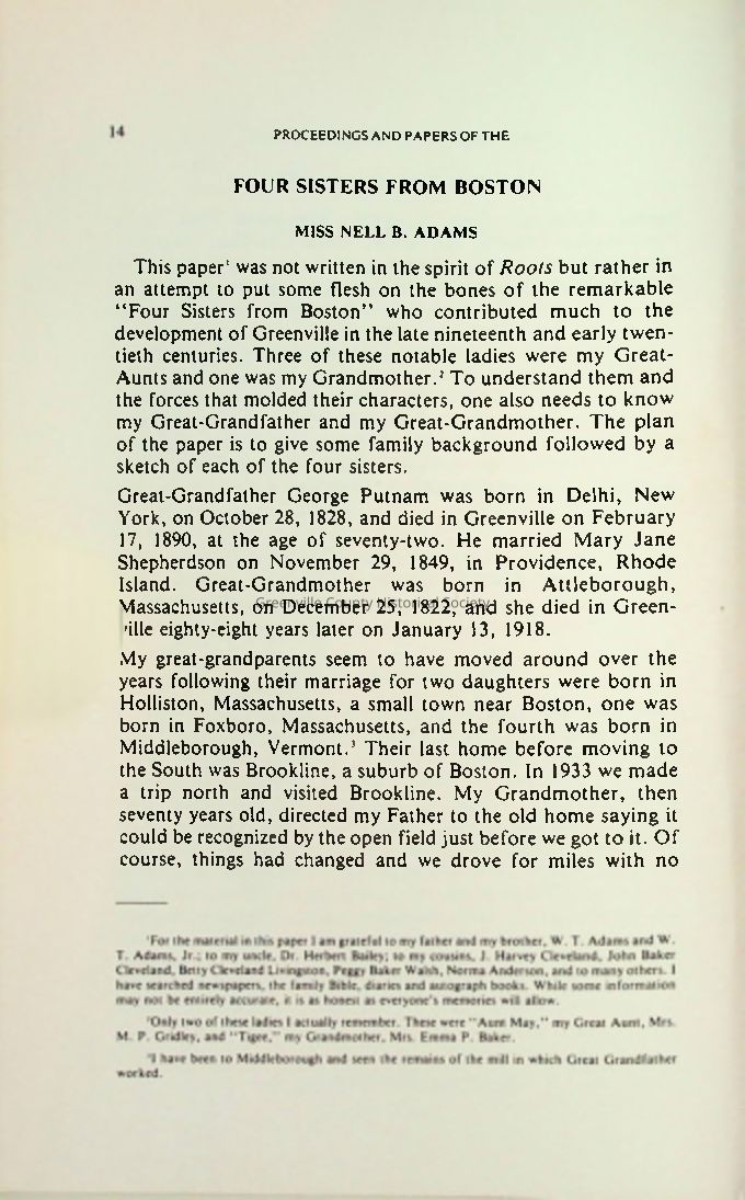 Four Sisters from Boston by Nell B. Adams recounts the lives and legacies of four Northern-born sisters—Mary, Emma ("Tigee"), Flora, and Daisy Putnam—who helped shape post-Civil War Greenville, SC. Daughters of George and Mary Jane Putnam, early textile industrialists, the sisters brought cultural and civic influence to the South. Aunt May led a cotton mill and founded key civic groups. Flora championed the hospital system. Tigee was adventurous and principled, while Daisy, though frail, was musically and socially vibrant. Their stories reflect the family's adaptation, leadership, and impact on Greenville's evolution into a progressive Southern city.Collection