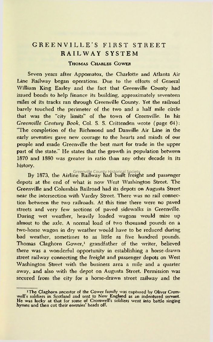 Greenville’s first street railway system, established in 1873 by Thomas Claghorn Gower, was a mule-drawn line connecting freight and passenger depots with the business district. It featured passenger and freight cars, a warehouse, and community facilities. The system supported local commerce and rail development until railroads merged and services centralized. Unable to afford electrification, the line ceased in 1897. Its legacy included figures like the mule "Lightning" and beloved driver Billy Fronaberger. The transition to electric streetcars began in 1898 under new ownership. This period marked Greenville’s shift from muddy streets to organized urban infrastructure and transportation.Collection