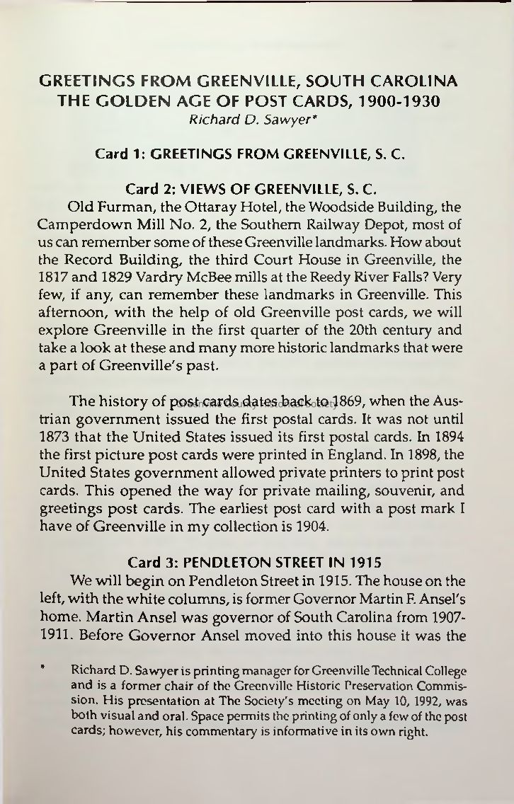 Greetings from Greenville, South Carolina: The Golden Age of Post Cards, 1900 - 1930Entry/Object ID