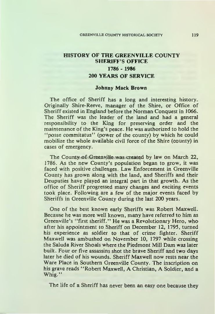 The History of the Greenville County Sheriff's Office (1786–1986) by Johnny Mack Brown chronicles two centuries of law enforcement evolution in Greenville County. Originating from the English "shire-reeve," the Sheriff's role adapted to local needs, marked by significant events such as the assassination of Sheriff Robert Maxwell in 1797, dramatic mob confrontations like the 1880s Simpsonville lynching case, and the 1947 lynching of Willie Earle that spurred reform. The mysterious 1927 murder of Sheriff Sam Willis and its eventual resolution further shaped the department’s history. By 1986, the office had modernized, becoming a professional force with nearly 200 officers.Collection