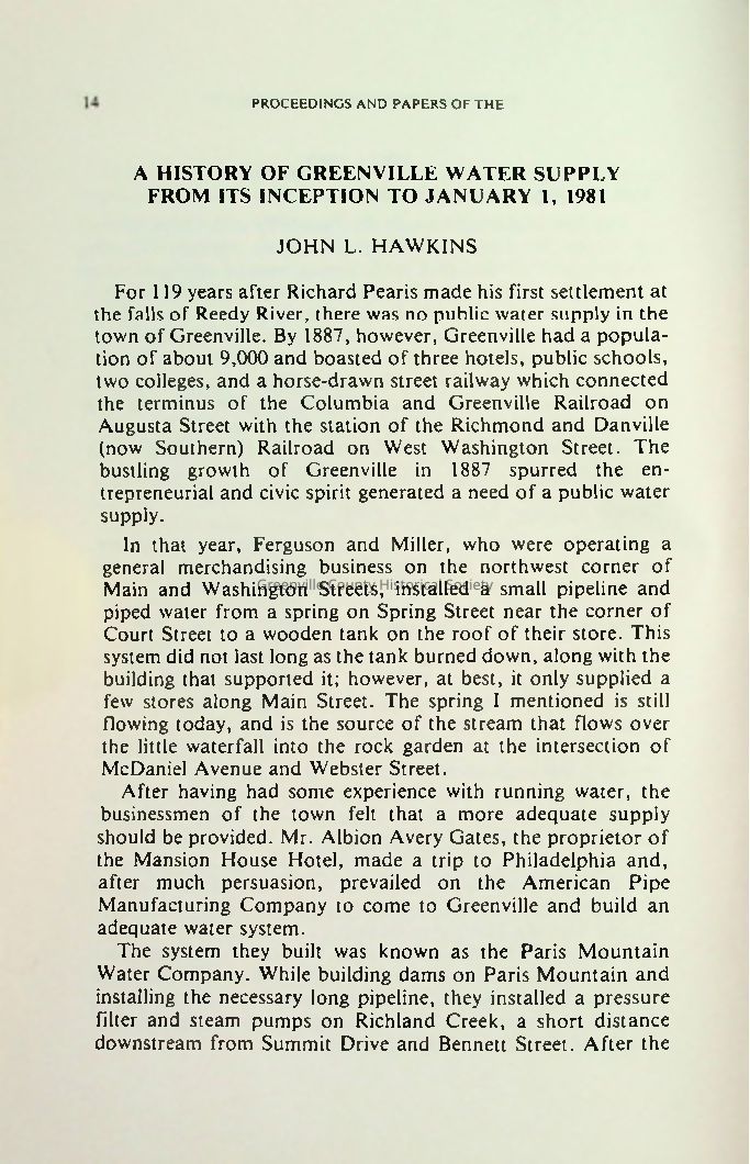 John L. Hawkins chronicles the development of the Greenville Water System from its inception in 1887 through 1981. Initially reliant on springs and a small local pipeline, Greenville’s water needs grew with its population and infrastructure. The Paris Mountain Water Company launched the first major system in 1888, followed by the city’s purchase in 1918. Major expansions included reservoirs, standpipes, and treatment plants, with sources eventually reaching Table Rock and North Saluda. The Keowee Project began in the 1970s to meet future demand. Throughout its history, the system was self-sustaining, debt-financed, and politically independent, serving a growing regional population.Collection