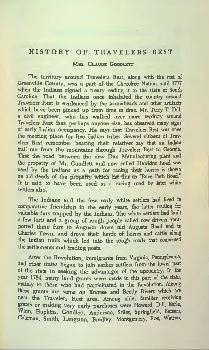 Mrs. Charlotte Goodlett’s 1968 history of Travelers Rest, South Carolina, recounts its evolution from Cherokee territory to a key stop for livestock drovers, traders, and stagecoaches. The town's name, coined by early travelers seeking rest at the mountain base, predates its 1808 post office. Key figures like Major Henry Lynch and Col. Robert Anderson developed inns that supported regional commerce. The community grew around churches, schools, and civic organizations. With advancements in transportation, industry, and education—culminating in a modern high school in 1956—the area transitioned into a thriving small town with strong community spirit and plans for continued development.Collection