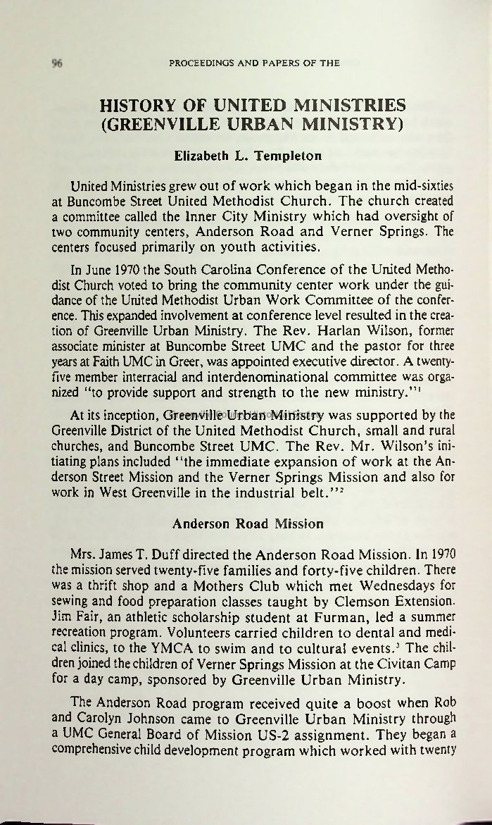 United Ministries, originally Greenville Urban Ministry, began in the 1960s from outreach work by Buncombe Street United Methodist Church. Led by Rev. Harlan Wilson, it developed multiple community-focused programs including child development, drug abuse support, emergency aid, and senior nutrition. It later expanded into housing, homelessness services, employment readiness, and block partnerships. Merging with the Christian Service Center, it became ecumenical, receiving support from many denominations. Under Rev. Beth Templeton’s leadership, the organization secured a permanent home, initiated innovative housing and volunteer programs, and restructured governance. By 1990, United Ministries offered diverse services through a strong volunteer and faith-based network.Collection