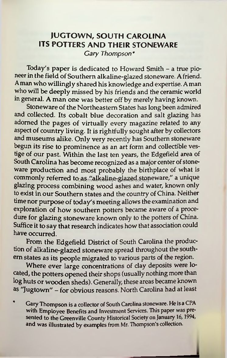 Gary Thompson’s paper explores the rich history of Jugtown, South Carolina, a major 19th- and early 20th-century center for alkaline-glazed stoneware. Located in Greenville County along the Tyger River, Jugtown was home to skilled potters like the Henson, Tapp, and Atkins families. Unique for its diverse glazes and for including Rich Williams—the only known Black potter in any Jugtown—its pottery served utilitarian needs before shifting to artware in response to market changes. Though once nearly forgotten, Jugtown's legacy is being revived through research and museum exhibits, highlighting its significance in Southern ceramic traditions.Collection