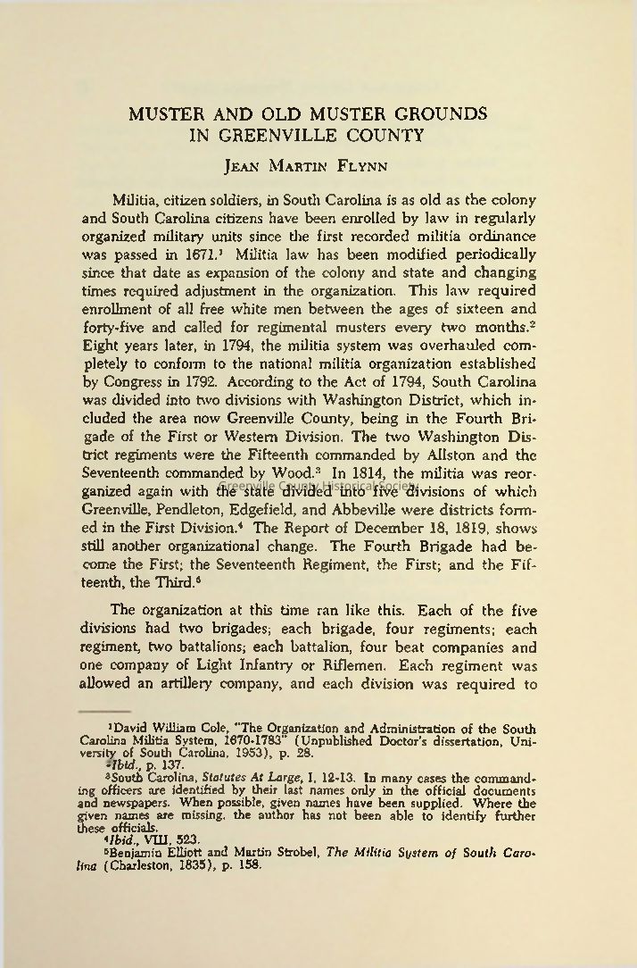 Jean Martin Flynn’s "Muster and Old Muster Grounds in Greenville County" explores the history and structure of South Carolina's militia system from colonial times through the mid-19th century. Militia laws required free white men to muster regularly for training, forming a complex system of regiments, battalions, and beat companies. Greenville County played an active role, with documented muster grounds and military units like the Tyger and Saluda Battalions. Political tensions during the Nullification Crisis disrupted the militia’s cohesion, as Unionist officers in Greenville resisted state mandates. Despite evolving criticism, the militia remained central to civic life until its transformation into the National Guard post-Civil War.Collection
