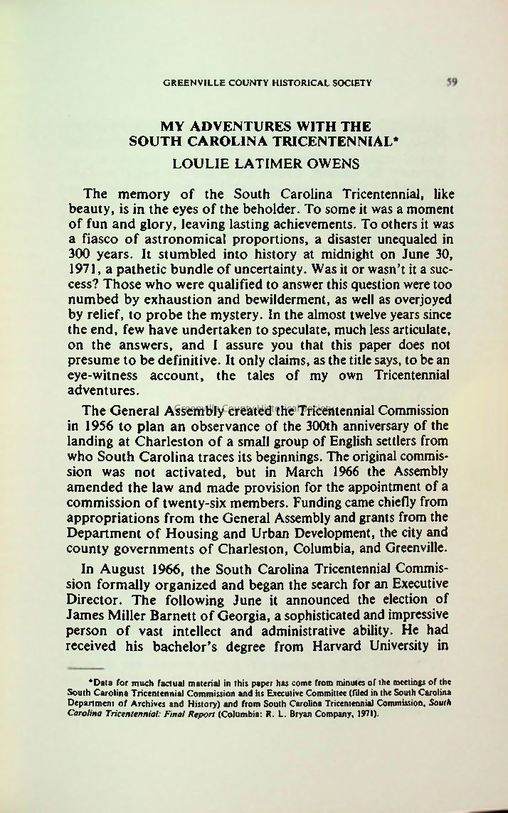 Loulie Latimer Owens offers a vivid, humorous, and candid insider’s account of South Carolina’s 300th birthday celebration. Initiated in 1966 and culminating in 1970–71, the Tricentennial was marked by political delays, financial strain, architectural fiascos, and public criticism. Despite setbacks—including an experimental Buckminster Fuller pavilion, lawsuits, and exhibit design chaos—Owens highlights the dedication of the staff, particularly in creating three historical centers across the state. She recounts personal experiences with research, exhibit design, and public outreach, concluding that the celebration sparked enduring historical interest, preservation, and pride in South Carolina’s heritage. In her words, “It was worth it!”Collection
