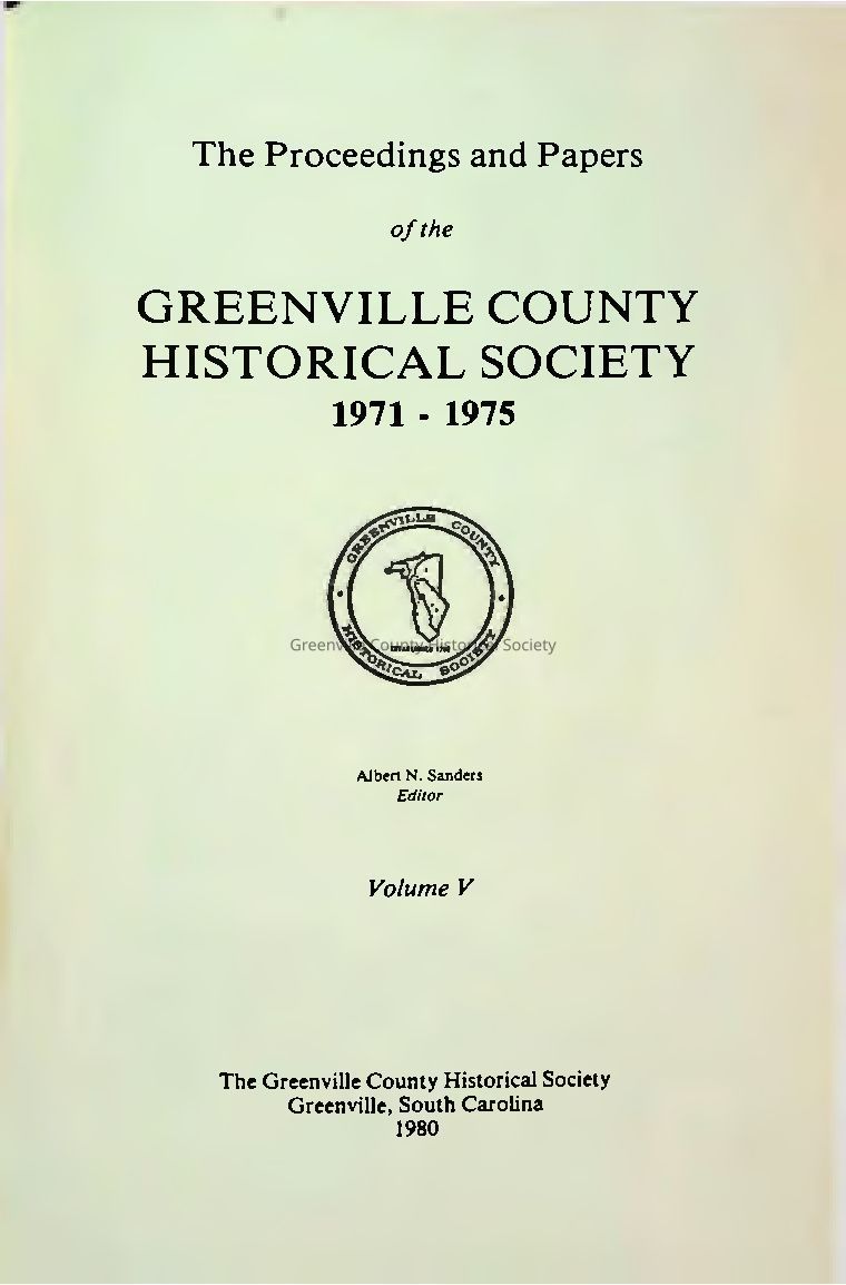 This volume, edited by Albert N. Sanders, compiles the historical activities and research presented by the Greenville County Historical Society from 1971 to 1975. It includes minutes of meetings, society updates, and a series of scholarly papers on topics central to Greenville’s development. Highlights include studies on early education, railroads, Benjamin F. Perry’s Unionist stance, the origins of the Greenville Municipal Airport, and John B. Watson’s psychological legacy. The publication reflects the Society’s dedication to preserving local history and showcases the community’s rich heritage through research, preservation efforts, and civic engagement.Collection