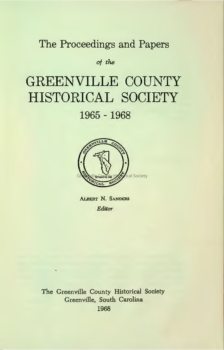 The 1968 Proceedings and Papers - Volume III of the Greenville County Historical Society compiles a range of historical essays, society records, and commemorative tributes from 1965 to 1968. It includes papers on significant local topics such as the relocation of Furman University, the history of Travelers Rest, early fire departments, and the development of the postal system in Greenville County. The volume also honors influential members like Sara Gossett Crigler and Hattie Choice Schroder. Meeting minutes detail the Society’s activities, including historical marker dedications and community engagements, reflecting a robust effort to preserve and promote Greenville’s heritage.Collection