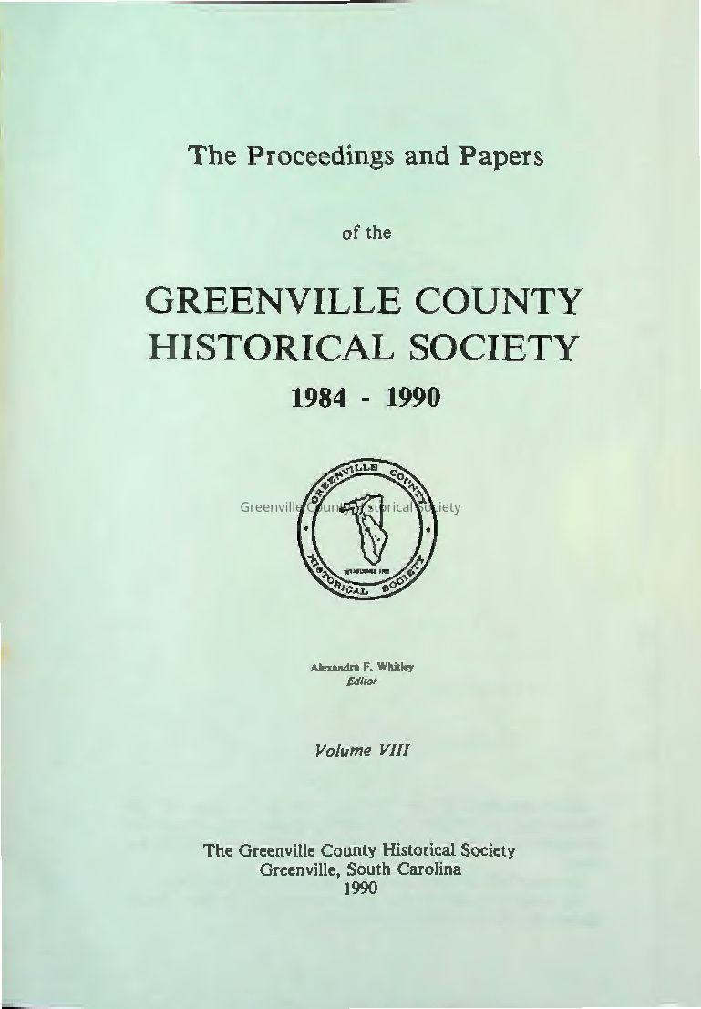 The 1990 Proceedings and Papers – Volume VIII of the Greenville County Historical Society compiles presentations, papers, and organizational updates from 1984 to 1990. It includes proceedings of meetings, honors to notable members, and scholarly articles on topics such as Captain Ellison Adger Smyth’s role in the textile industry, the history of power generation in Greenville, the history of medicine, the Greenville Hospital System, Main Street’s transformation, and other aspects of local heritage. It serves as both a chronicle of the Society's internal activities and a valuable repository of Greenville County’s historical narratives as presented by various contributors.Collection