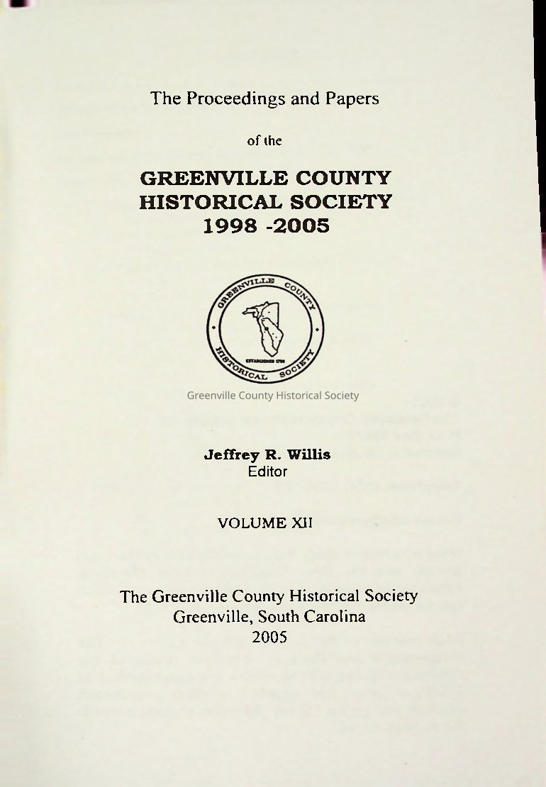 Proceedings and Papers of the Greenville County Historical Society, Volume XII (1998–2005) is a rich compilation of presentations and articles that explore Greenville's history from multiple perspectives. Edited by Jeffrey R. Willis, it includes detailed research on figures like Reverend Alexander Mitchell and General Waddy Thompson, studies of Greenville’s architecture, Jewish and Greek communities, Furman University, and pivotal local events. The volume also documents society proceedings and preservation efforts, such as saving the Coxe Collection of historic photographs. This collection provides a unique lens into Greenville's cultural evolution and the people who shaped it over time.Collection