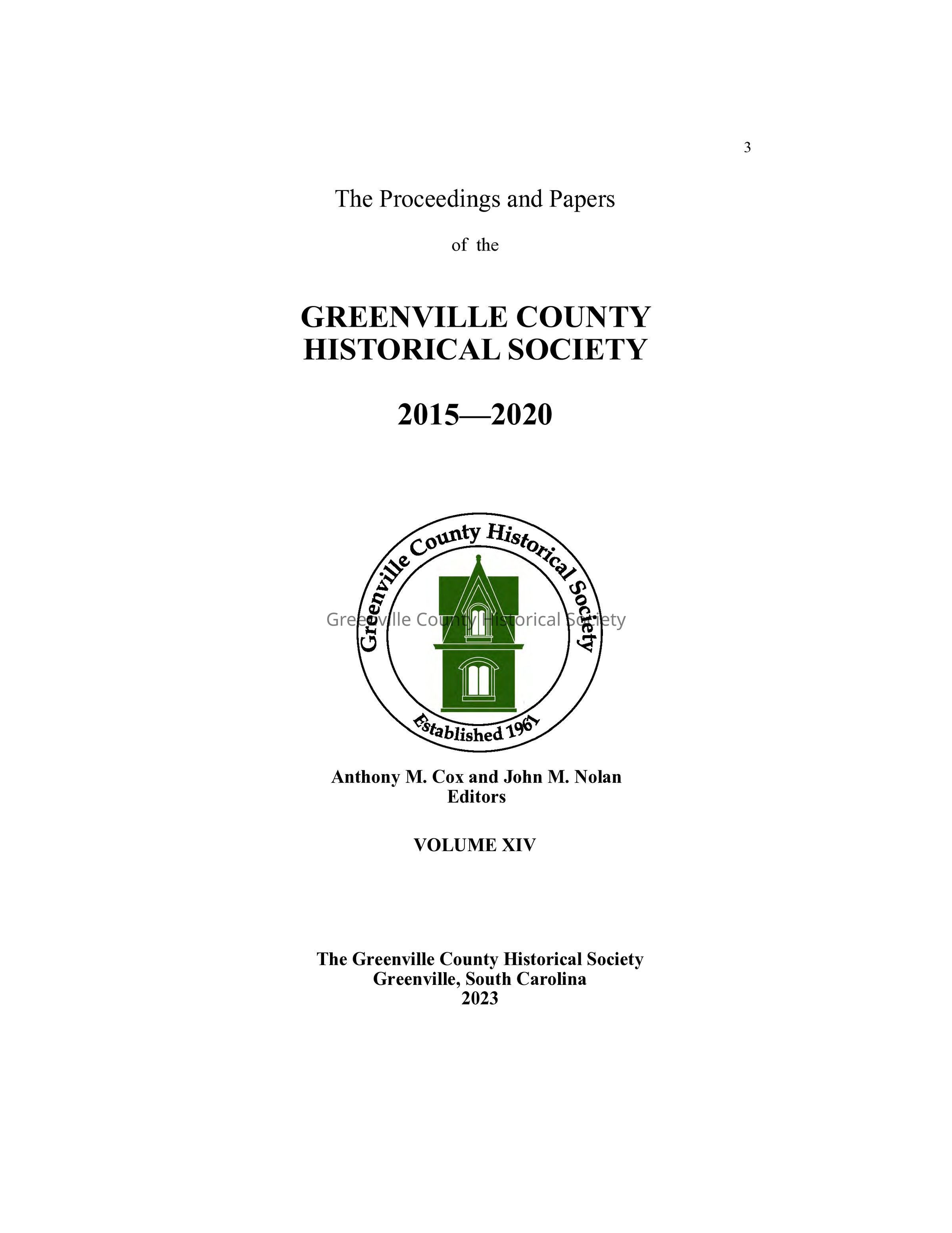 Volume XIV of the Greenville County Historical Society’s Proceedings and Papers compiles valuable historical research from 2015 to 2020, covering diverse topics related to Greenville County. Highlights include the biography of Nobel Laureate Charles Townes, Trinity Church’s historic preservation, racial integration in local schools and its impact on athletics, and the development of Southern Bleachery and Taylors Mill. Other notable subjects discussed are local moonshine culture and its connection to NASCAR, and Greenville's Brutalist architectural movement. These collected works provide significant insights into the region's social, economic, and cultural evolution, reflecting Greenville’s rich historical heritage.Collection