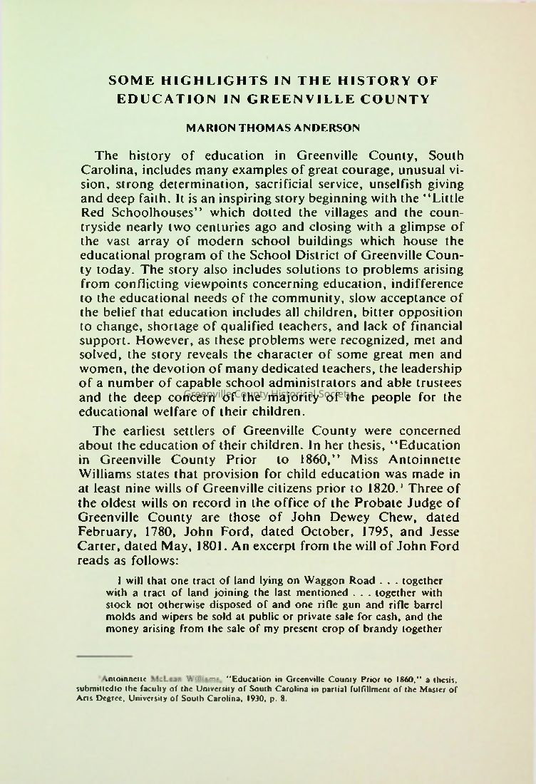 Some Highlights in the History of Education in Greenville CountyEntry/Object ID