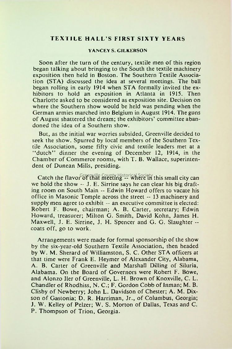 Textile Hall’s first sixty years reflect Greenville’s emergence as a major center of the textile industry. Sparked by local leaders in 1914, the Southern Textile Exposition began in 1915, drawing national attention. The first Textile Hall opened in 1917, hosting biennial expositions showcasing textile innovation. Despite interruptions by war and economic challenges, the shows expanded, eventually attracting global exhibitors. In 1923, Textile Hall was reorganized as a public nonprofit. Under dynamic leadership, it grew to a major international venue, with 1960s expansions culminating in the landmark 1964 show. By 1974, Greenville was the recognized world center for textile exhibitions.Collection