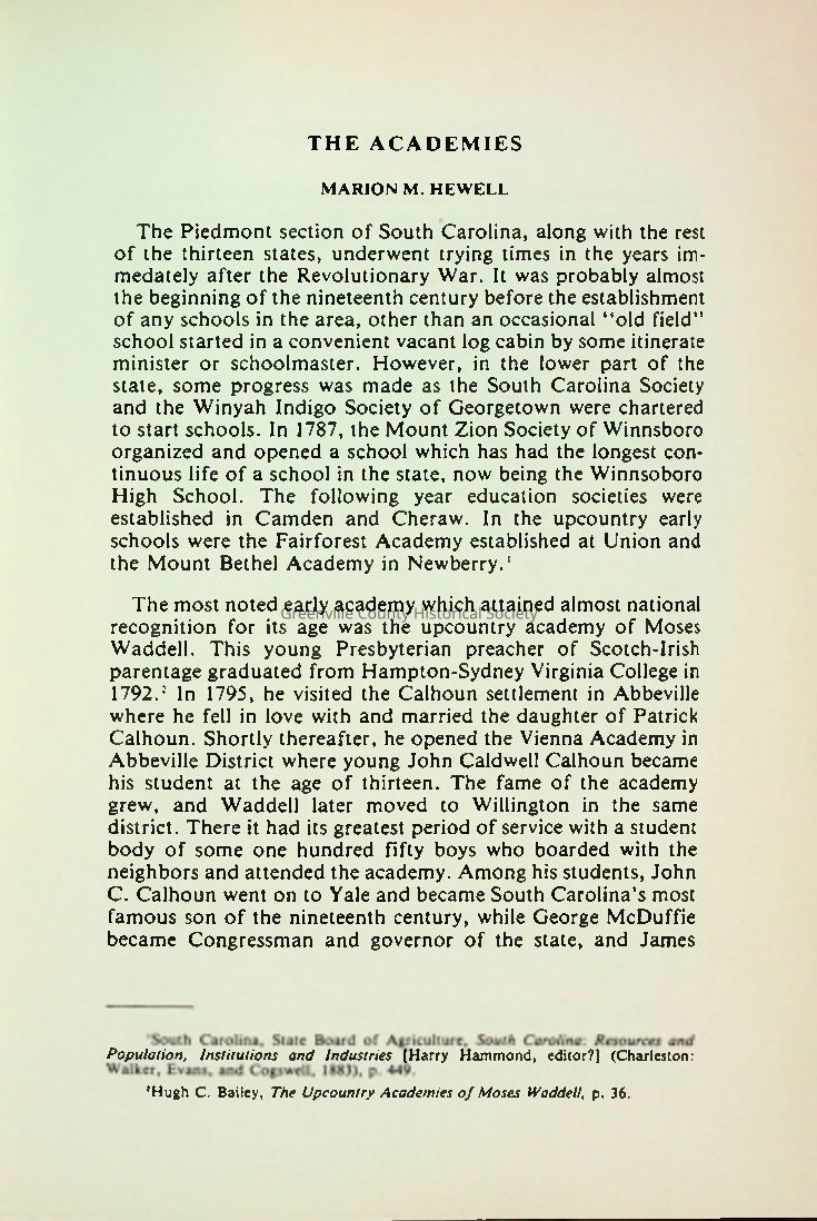 Following the Revolutionary War, education slowly developed in South Carolina, with the upcountry lagging behind the coast. In Greenville, the community established the Male and Female Academies in 1820 through private subscriptions and land donated by Vardry McBee. The schools operated under a trustee board and were supported by tuition, donations, and occasional escheated property. Despite internal conflicts and funding challenges, the academies educated many notable figures. By 1854, the rise of Furman University and a proposed Baptist Female College led to their closure. Private and denominational schools continued until Greenville launched its public school system in 1886.Collection
