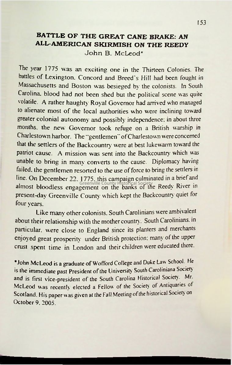 The Battle of the Great Cane Brake, fought on December 22, 1775, near present-day Greenville, South Carolina, was a brief but pivotal Revolutionary War skirmish. Patriot forces under Colonel William Thomson launched a surprise attack on Loyalist troops led by Patrick Cunningham camped along the Reedy River. Despite being forewarned, the Loyalists quickly surrendered after minimal resistance. This encounter was part of the larger "Snow Campaign," which aimed to quell Loyalist uprisings in the Backcountry. The victory helped secure the region for the Patriot cause and kept the area quiet for several years, bolstering revolutionary momentum in South Carolina.Collection