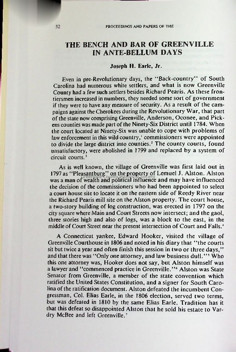 This paper recounts the evolution of the legal profession in antebellum Greenville, South Carolina, spotlighting prominent figures like Benjamin F. Perry, Waddy Thompson, and Baylis J. Earle. It traces the development of courts, major legal cases, political conflicts such as the Nullification Crisis, and personal rivalries that shaped Greenville’s legal and political climate. Through biographical sketches, it highlights the intertwining of law, journalism, and politics, especially Perry's staunch Unionism amid rising secessionist sentiment. The account concludes with the Civil War's disruption and the legacy of Greenville’s legal pioneers, emphasizing their roles as civic leaders and defenders of justice in turbulent times.Collection