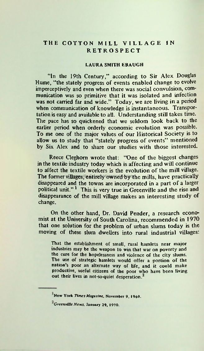 Laura Smith Ebaugh’s The Cotton Mill Village in Retrospect reflects on the development, impact, and eventual decline of textile mill villages in Greenville County, South Carolina. Originating from economic necessity, these villages housed workers close to mills and fostered cultural and social growth among formerly rural populations. Mill owners provided housing, education, healthcare, and community services. Over time, improved transportation and changing labor models made such villages obsolete. Ebaugh praises the transformative role of mill life in uplifting communities and emphasizes the importance of understanding historical progress. She calls for thoughtful planning to meet future challenges, grounded in lessons from the past.Collection