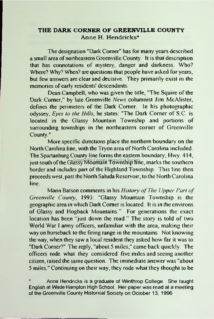 The Dark Corner of Greenville CountyEntry/Object ID