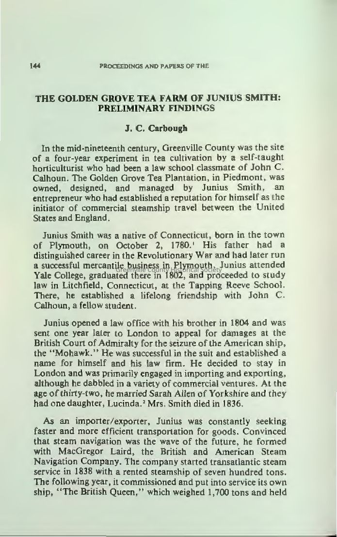 In the mid-1800s, Junius Smith, a Yale-educated entrepreneur and pioneer of transatlantic steamship travel, launched a bold experiment to cultivate tea in Greenville County, South Carolina. Inspired by his daughter's letter describing tea growth in the Himalayas, Smith imported seeds and plants from Asia and founded the Golden Grove Tea Plantation near Piedmont in 1848. Despite skepticism, he diligently studied cultivation methods, published essays, and promoted tea farming. Though he never harvested commercially, Smith's plantation flourished with diverse crops. He was later attacked under suspicious circumstances and died in 1853. His efforts mark one of America’s earliest attempts at tea production.Collection