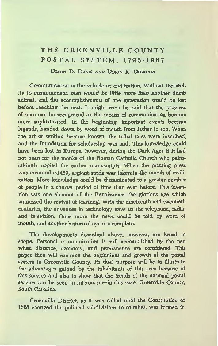 The Greenville County Postal System, 1795-1967Entry/Object ID