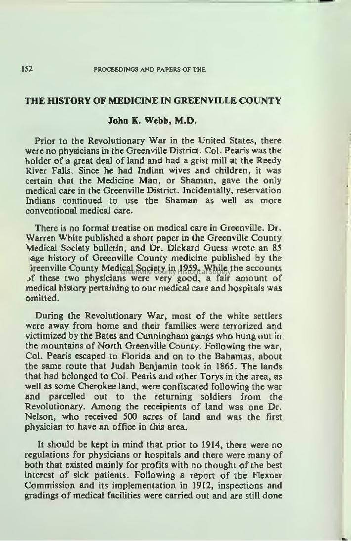 ohn K. Webb, M.D.'s History of Medicine in Greenville County traces local healthcare from Native American medicine men to the modern hospital system. The first physician, Dr. Nelson, arrived post-Revolution, followed by notable early doctors like Dr. A.B. Crook. During the Civil War, the "Soldiers’ Rest" became Greenville’s first hospital. Efforts by women’s groups led to the creation of Greenville City Hospital in 1912. The narrative highlights key figures like Dr. T.R.W. Wilson and Dr. Max Davis and the evolution of medical practices and institutions, culminating in the advanced Greenville Hospital System with accredited facilities and specialized medical staff.Collection